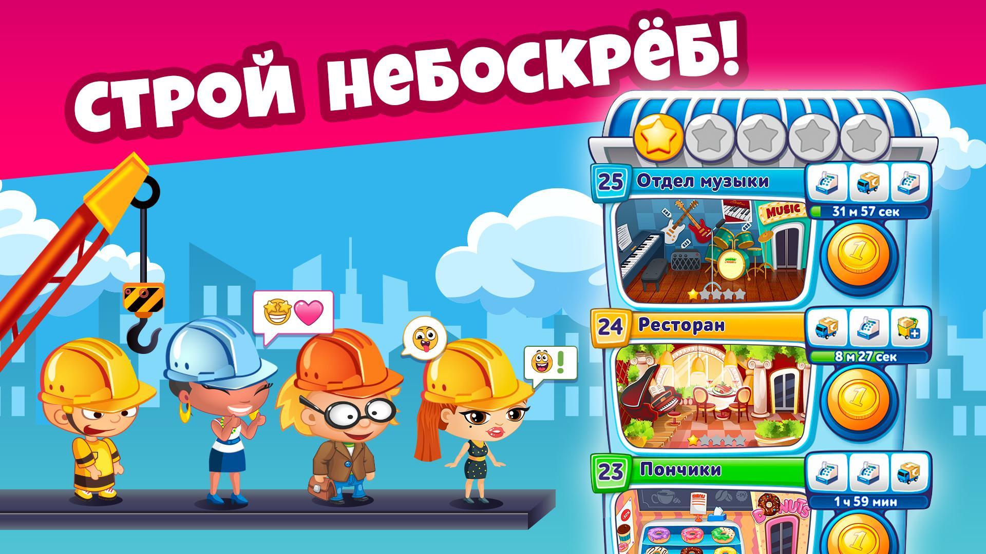 Начните строительство с первого этажа и откройте на нем любой бизнес по вашему выбору — от кондитерской до парикмахерской. Для эффективной работы наймите сотрудников среди жителей вашего небоскреба, предоставив им работу мечты. Постепенно расширяйте свою империю, добавляя новые этажи и увеличивая доход.