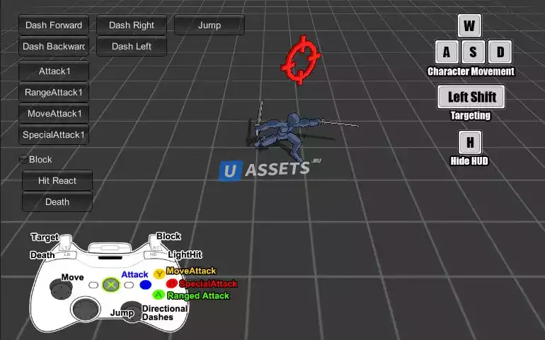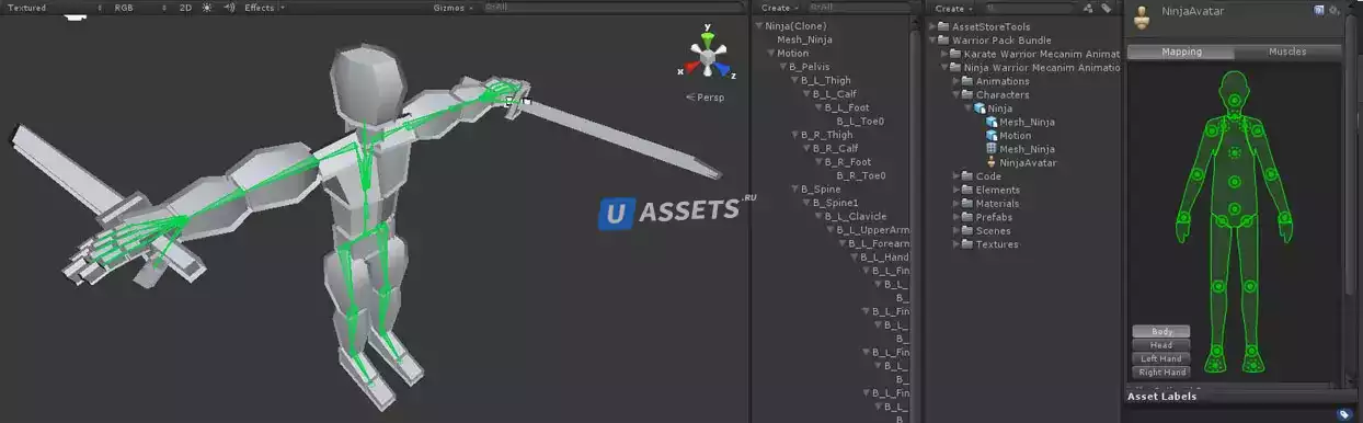 Полный набор из 62 отточенных и профессиональных анимаций воина-ниндзя, настроенный как гуманоид Mecanim с включенным полнофункциональным скриптом контроллера персонажа, совместимым с геймпадом Xbox360, с поддержкой физики, готовый к использованию в вашей игре.