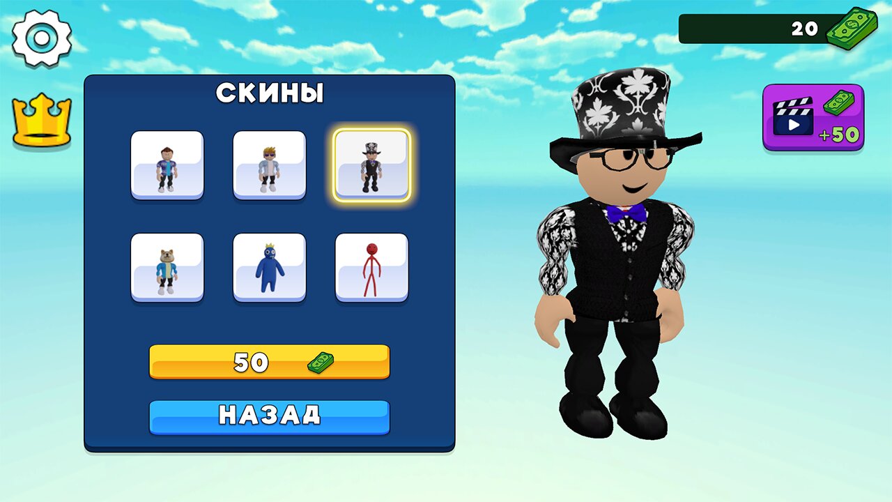 Одной из ярких особенностей приложения является обширная коллекция скинов для персонажей. Игрок может разблокировать и играть за различных героев, включая Обби, Робби, стикмена, собачку Doggy и персонажей из серии Rainbow Friends. Монеты, собранные во время забегов, тратятся на открытие новых образов, что позволяет создать уникальный стиль для своего аватара.