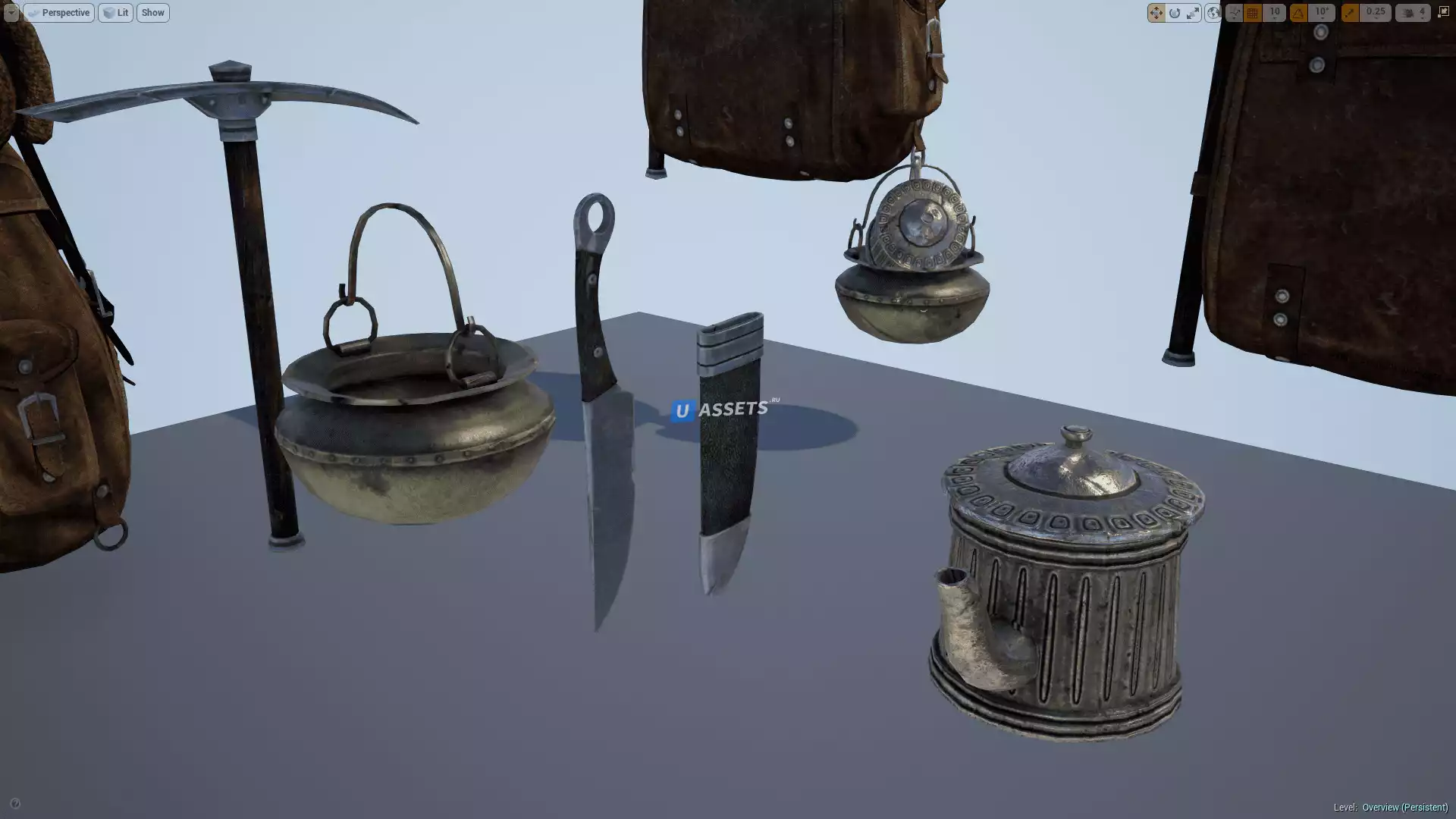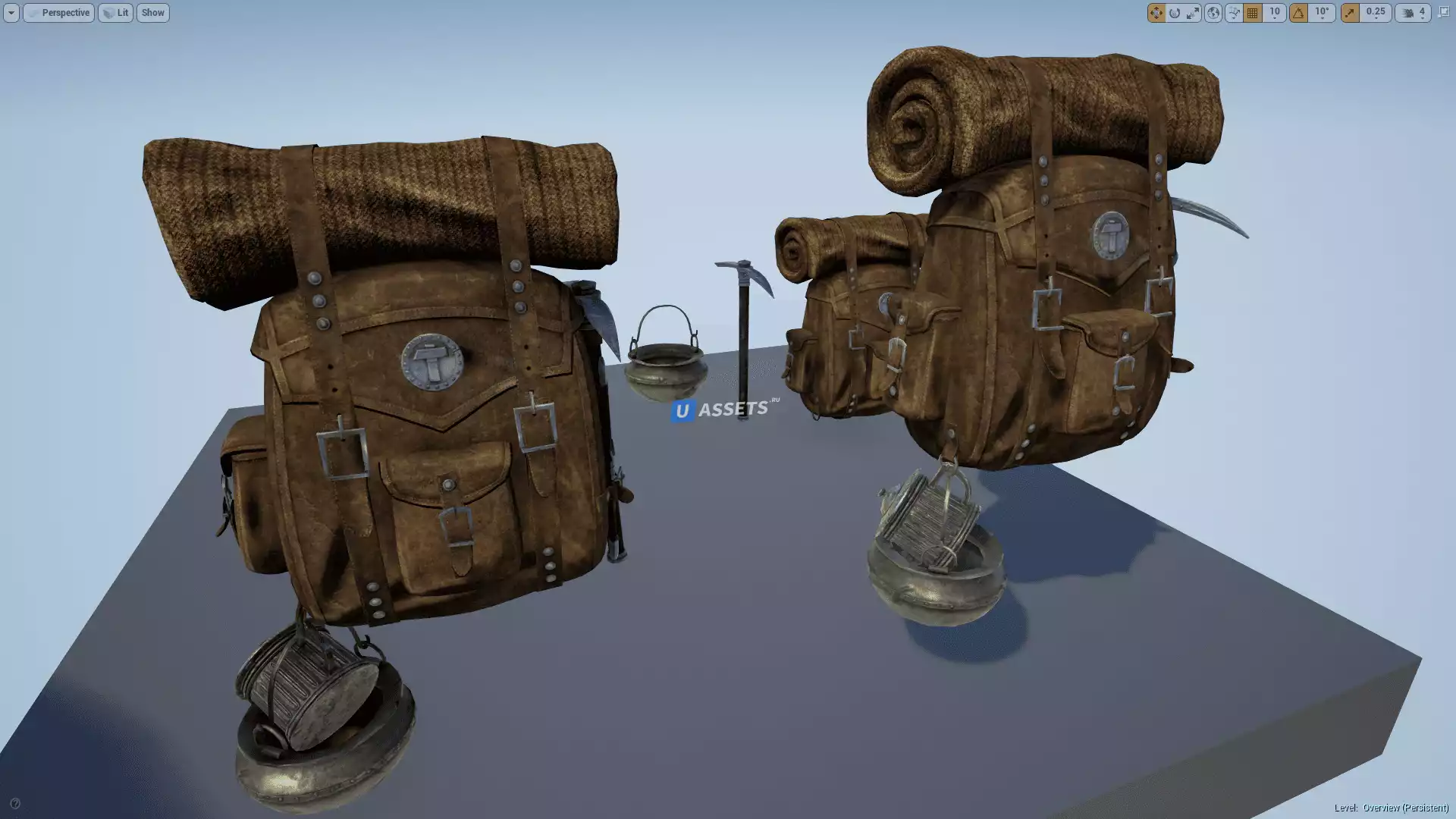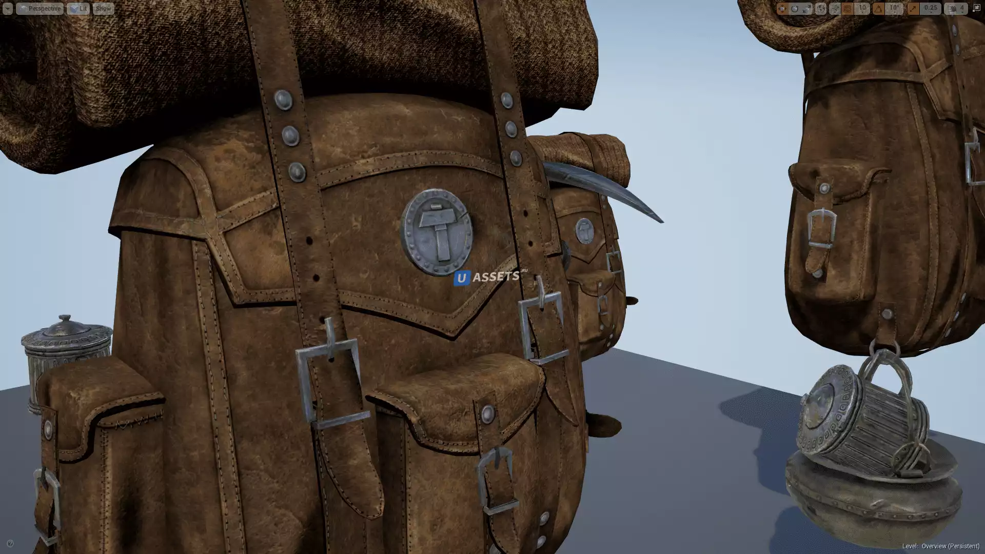 Рюкзак вместе со всем реквизитом: 5 689 полигонов, 11 206 треугольников, 6 016 вершин.