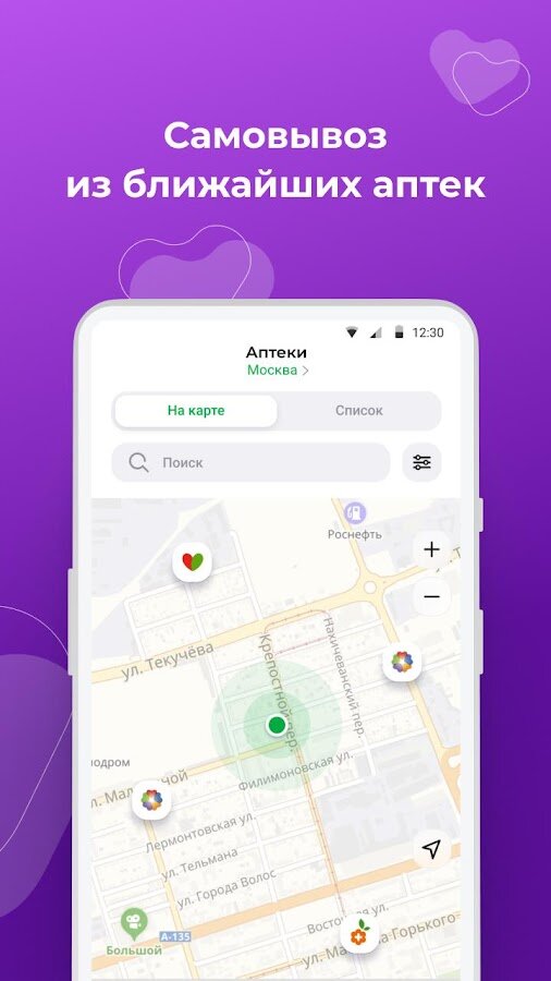 - Интерактивная карта: Удобная карта с отображением всех аптек сети для выбора наиболее подходящего пункта выдачи.