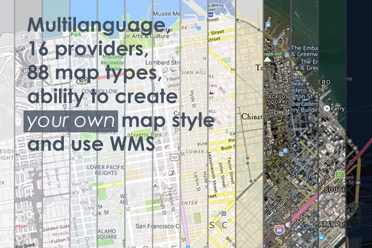 •Огромное количество предопределенных источников плиток: Google Maps, Mapbox, ArcGIS, Nokia Maps, Bing Maps, Open Street Maps и многие другие (16 поставщиков, 88 типов карт);