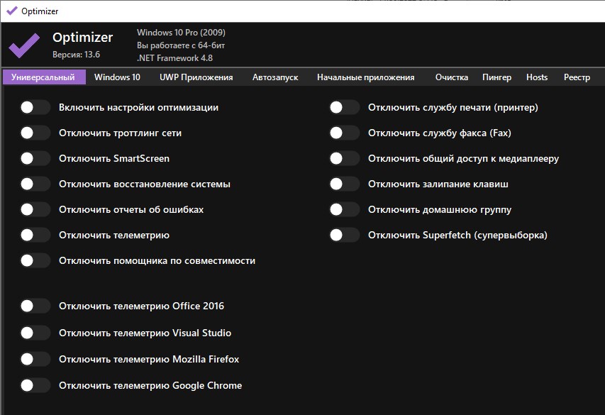 Optimizer - это комплексное решение, предоставляющее централизованный доступ к различным инструментам для оптимизации Windows. Это включает в себя настройки системы, очистку данных браузера, удаление UWP-приложений, а также установку множества полезных бесплатных программ и утилит, таких как пинг, управление файлами hosts, сведения о компьютерном оборудовании и многое другое.