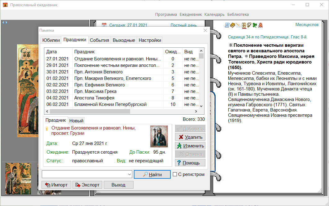 В церковном календаре вы легко сможете вносить изменения в большинство имеющихся текстов, добавлять ссылки на медиаресурсы, добавлять и удалять праздничные иконы.