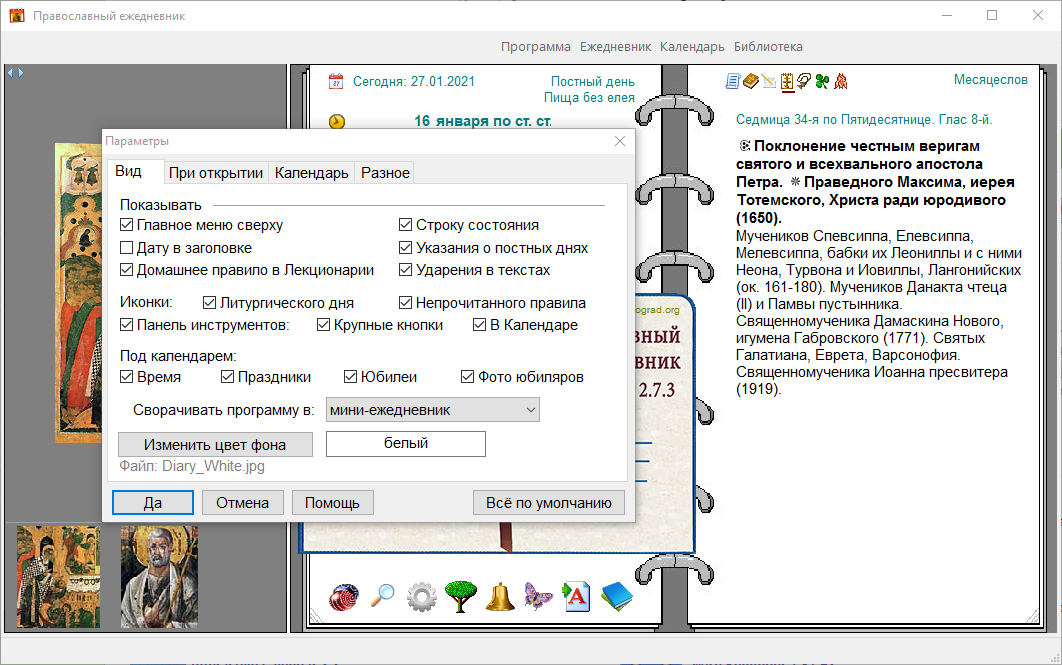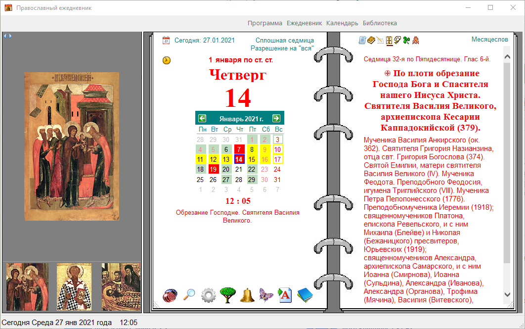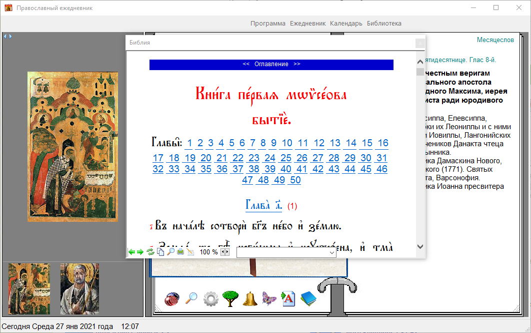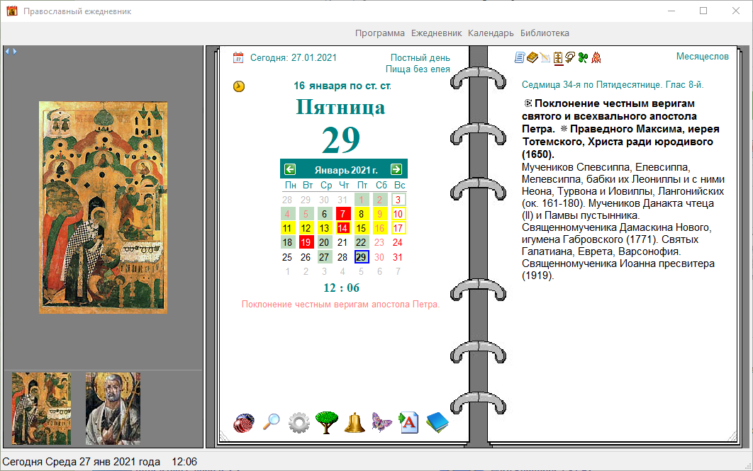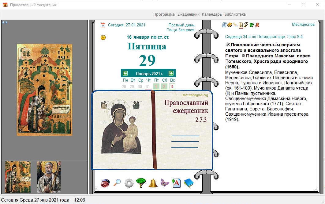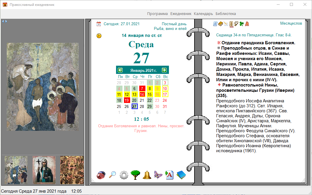 Православный ежедневник - предназначен для просмотра православного церковного календаря, с Богослужебными чтениями, Библией, молитвословом на ц-сл. и русском языках, житиями святых, проповедями, тропарями и кондаками на каждый день любого года.