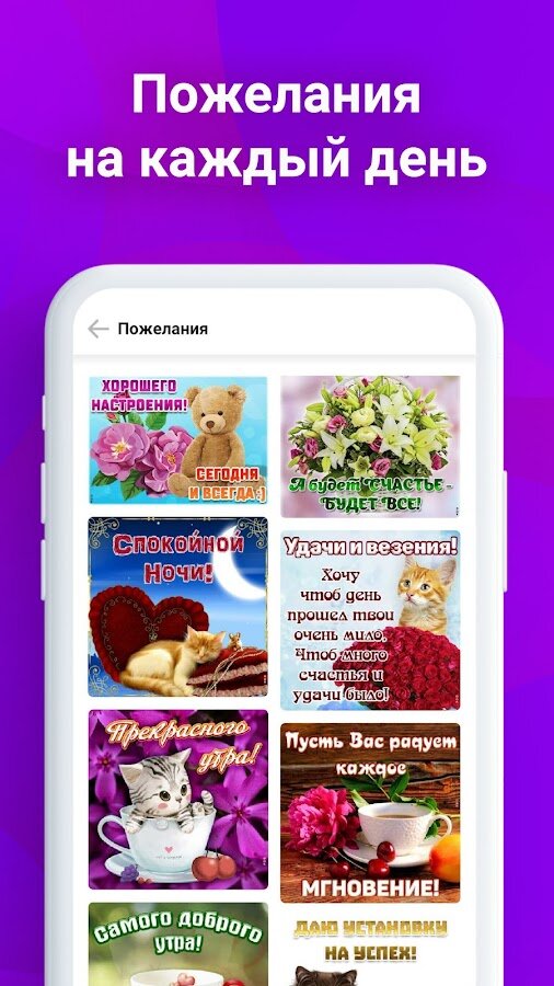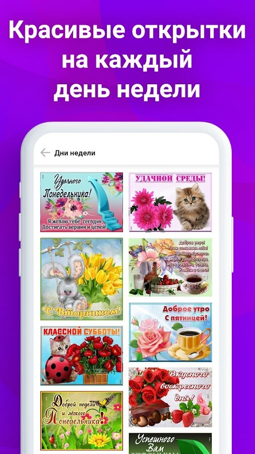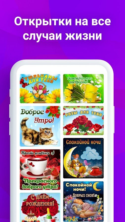 В коллекции приложения ОТКРЫТКИ И ПОЗДРАВЛЕНИЯ 1.9.2 более 50 000 живых открыток на все случаи жизни, поэтому для удобства пользователей все они разделены по категориям. Вне зависимости от события вы легко найдете подходящую картинку с поздравлением или пожеланием.