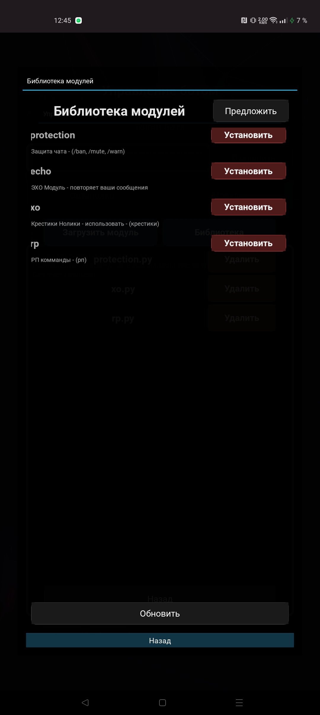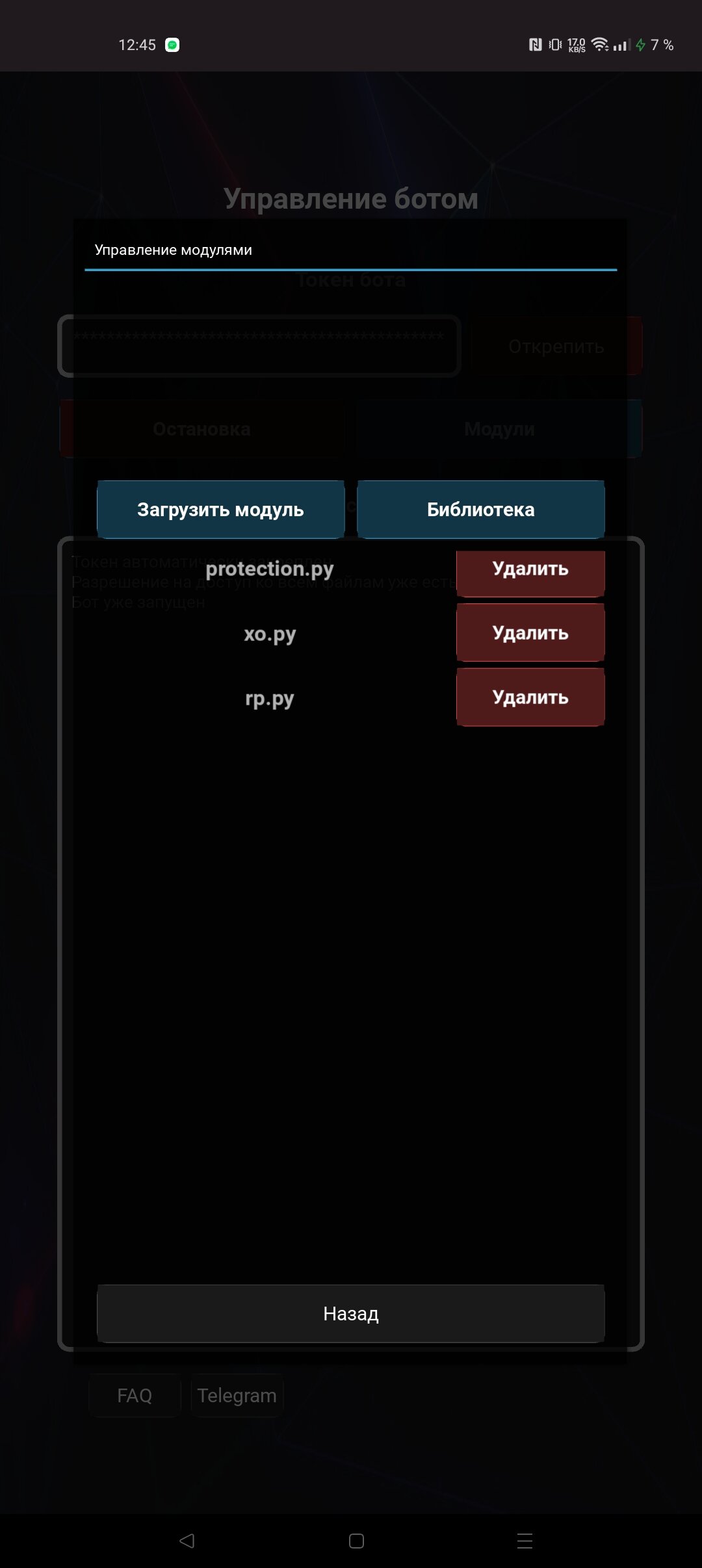 P1PLAYMANAGER — БОТЫ TELEGRAM — это специализированное приложение для Android, которое позволяет быстро и легко запускать и управлять ботами для мессенджера Telegram прямо с мобильного устройства. Программа предоставляет удобную платформу для работы с ботами, поддерживая загрузку и выполнение пользовательских модулей, написанных на языке Python.
