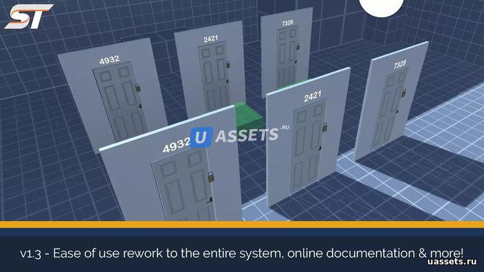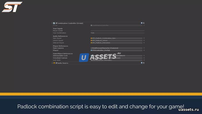 Эта система головоломок с навесным замком представляет собой полный шаблон для реализации вашей собственной системы замков и комбинаций. Висячий замок позволяет вам ввести 4-символьный строковый код, который, если он будет подобран игроком путем перемещения вращателей висячего замка, позволит некоторому типу взаимодействия открывать двери / сундуки и т.д.