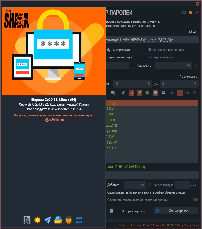 Password Generator 2025.12.01.900 — это удобный и безопасный инструмент для создания надежных паролей. Программа помогает генерировать сложные комбинации символов, необходимые для защиты ваших учетных записей, социальных сетей, банковских сервисов и других важных данных в интернете.