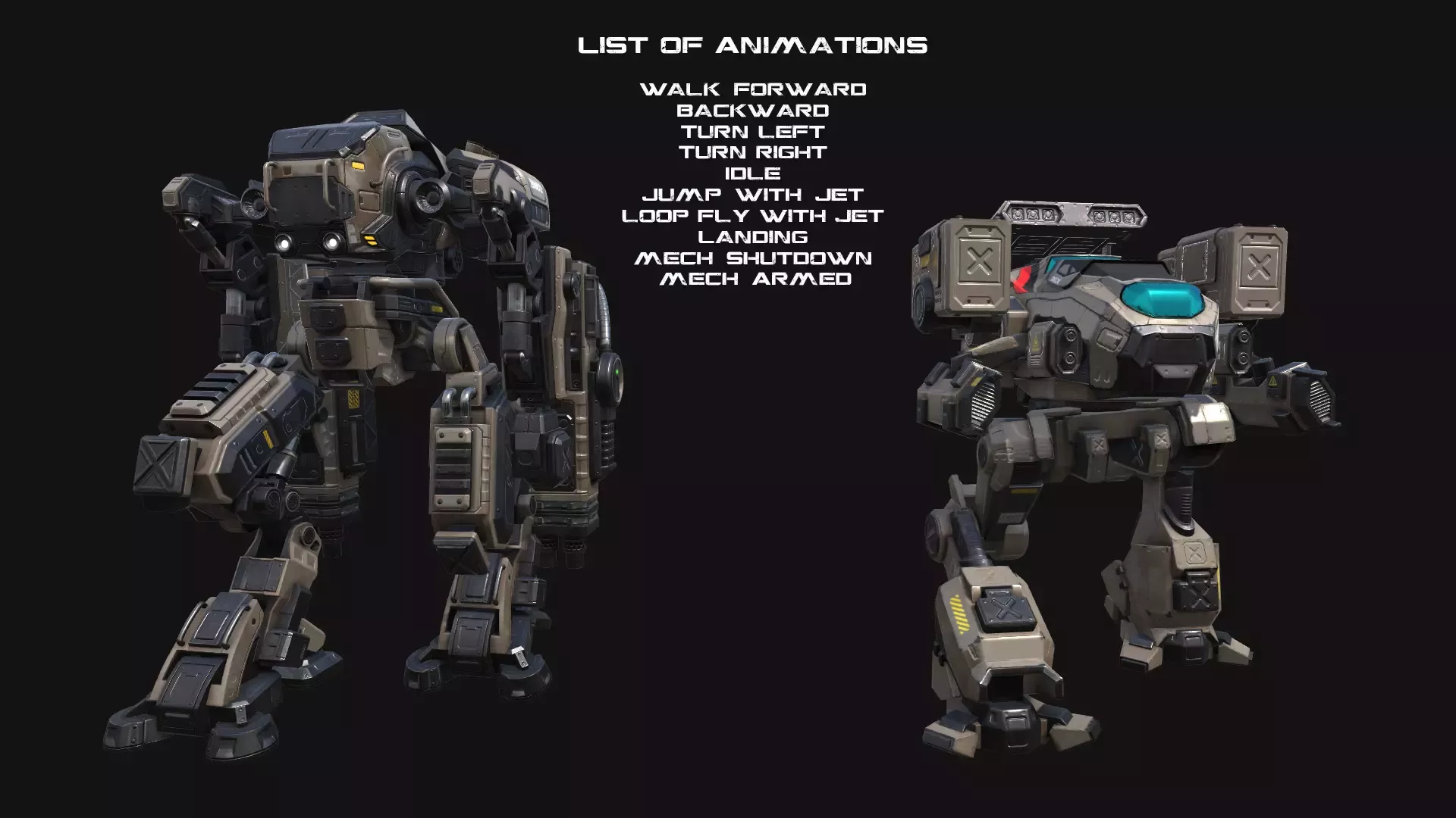 Шасси_v2 (1 сборная модель с 4 цветовыми вариациями для PBR и мобильных устройств. Анимации ходьбы, движения назад, поворота влево и вправо, холостого хода, реактивного прыжка, реактивного полета, посадки, выключения и постановки на охрану)