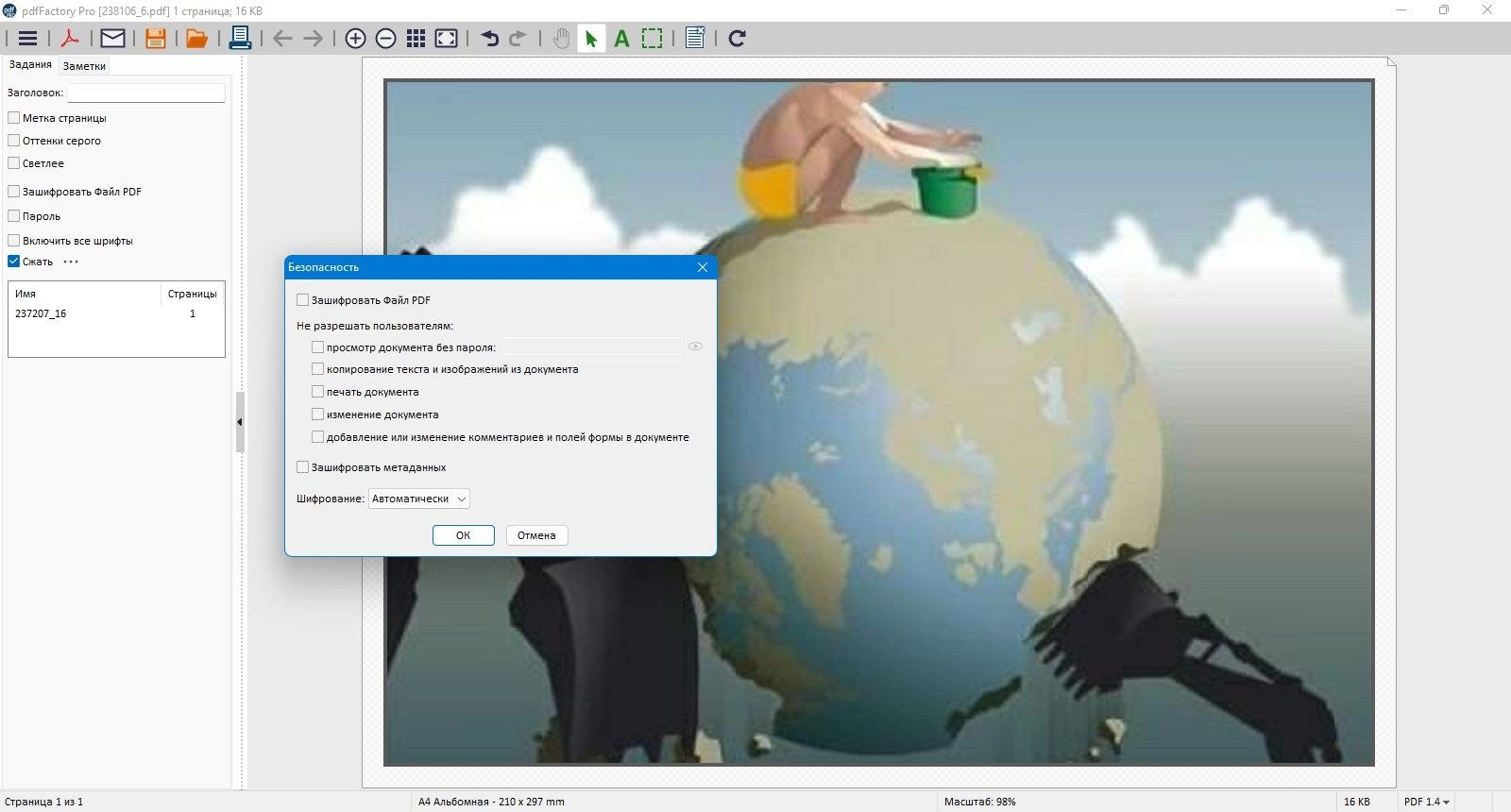 Основные возможности PdfFactory Std & Pro 8.42 включают объединение нескольких документов в один PDF-проект, предварительный просмотр результата перед сохранением, а также защиту файлов. Пользователи могут устанавливать пароли для открытия документов, шифровать их и запрещать редактирование.