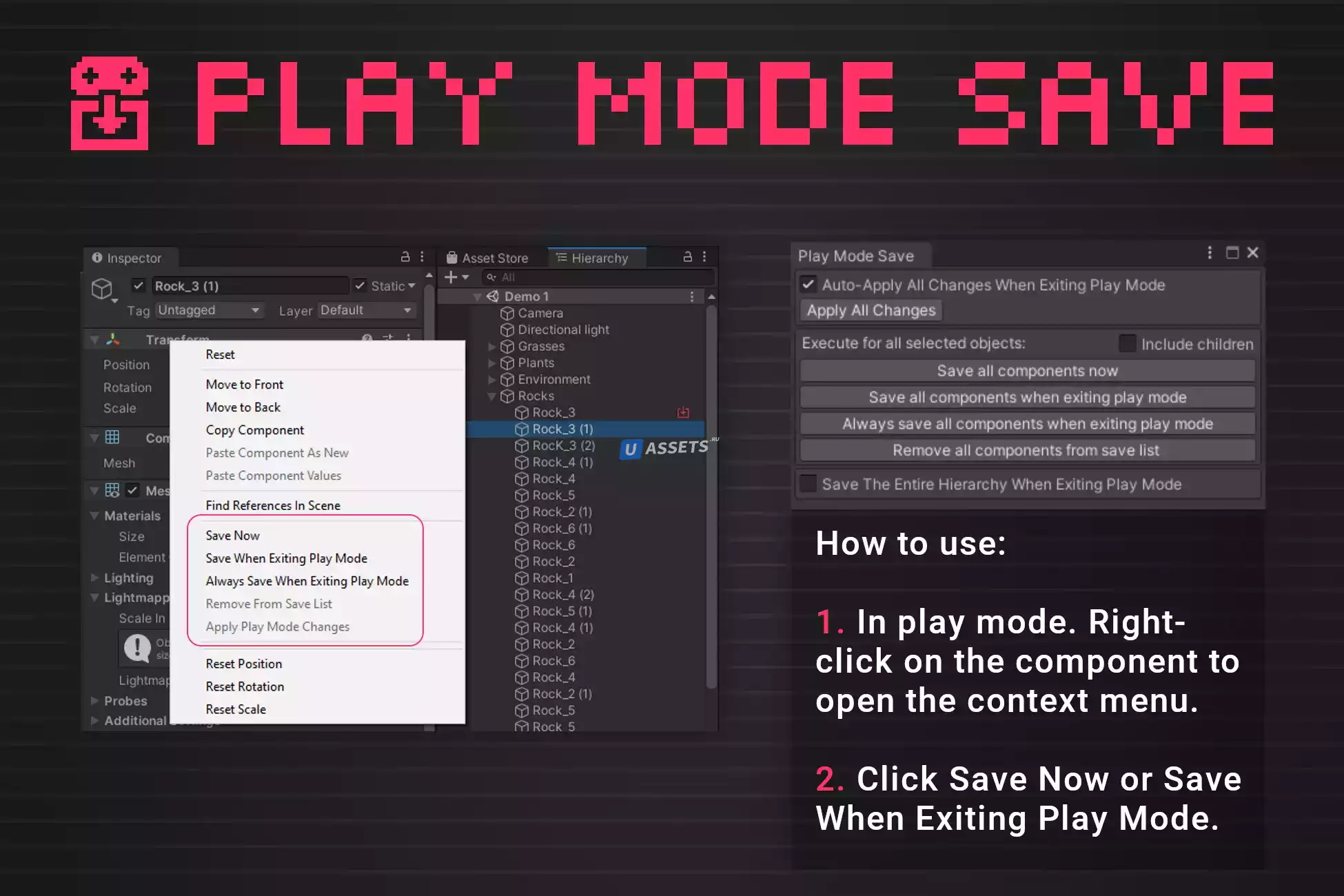 - Сохраняйте объекты и компоненты, созданные в игровом режиме.