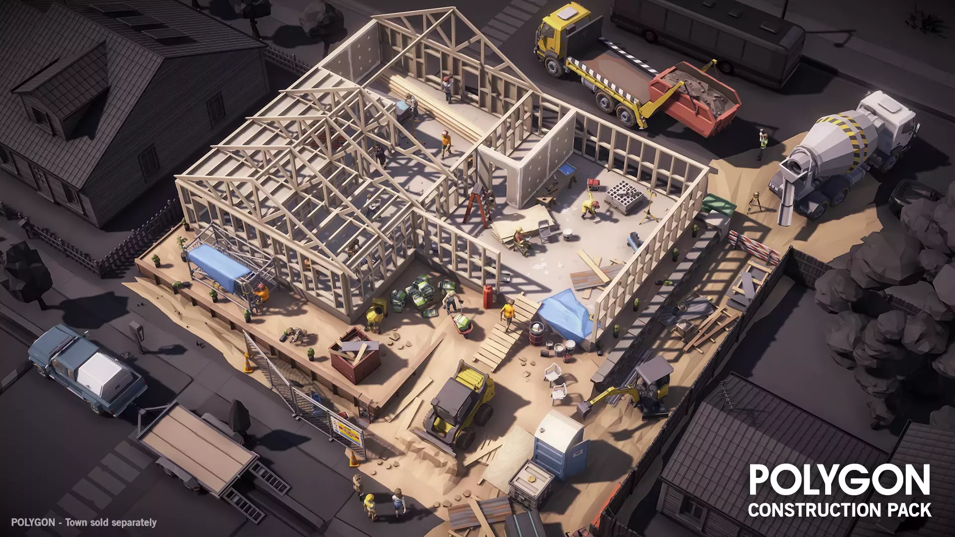 Набор низкополигональных объектов, включающий здания, персонажей, реквизит, инструменты и объекты окружающей среды для создания игры в полигональном стиле на строительную тематику.