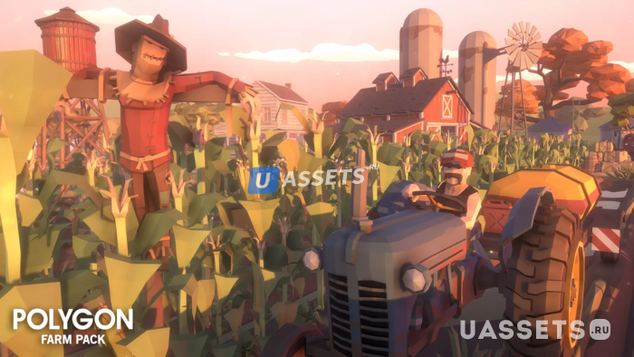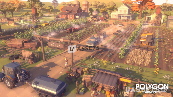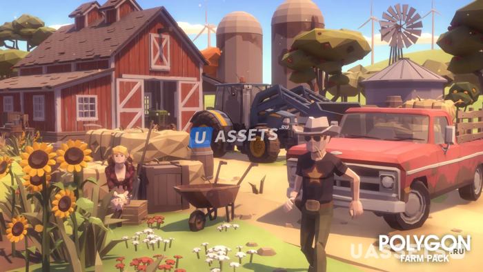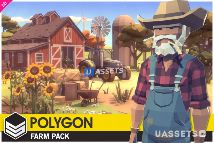 Пакет низкополигональных активов, состоящий из зданий, транспортных средств, Персонажей, Растений и реквизита для создания игры в полигональном стиле на тему фермы.