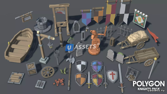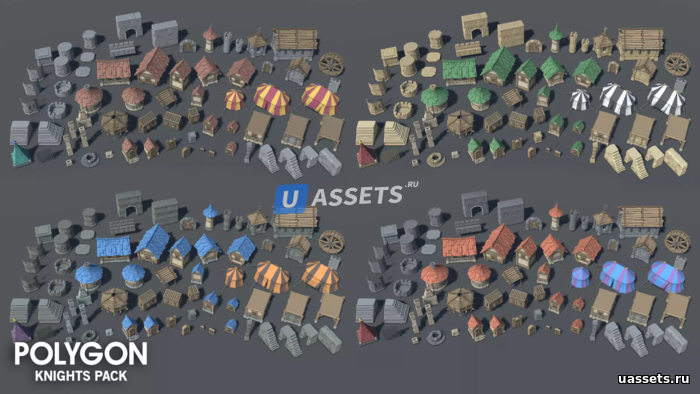 Набор низкополигональных персонажей, зданий, реквизита, предметов и ресурсов окружающей среды для создания фэнтезийной игры в полигональном стиле.