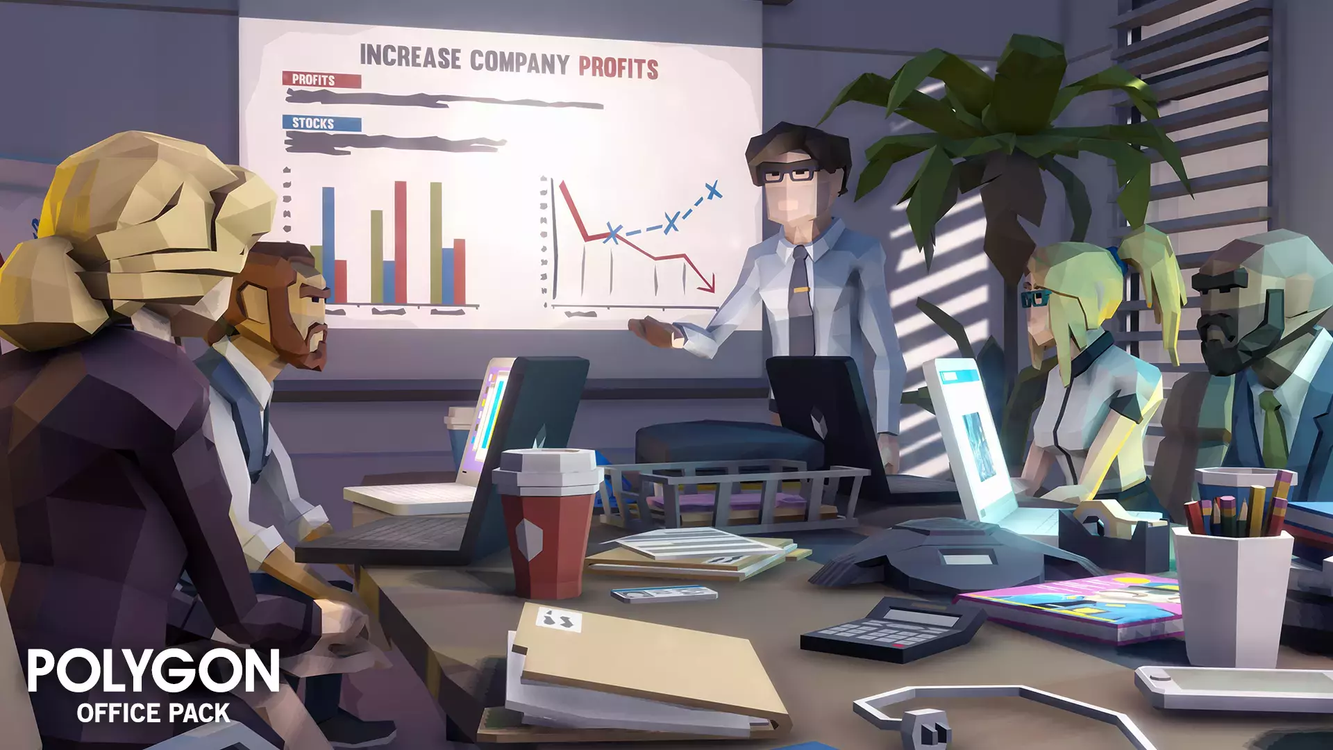 Пакет низкополигональных объектов, состоящий из реквизита, персонажей и модульных зданий для создания полигональной игры в стиле Office.