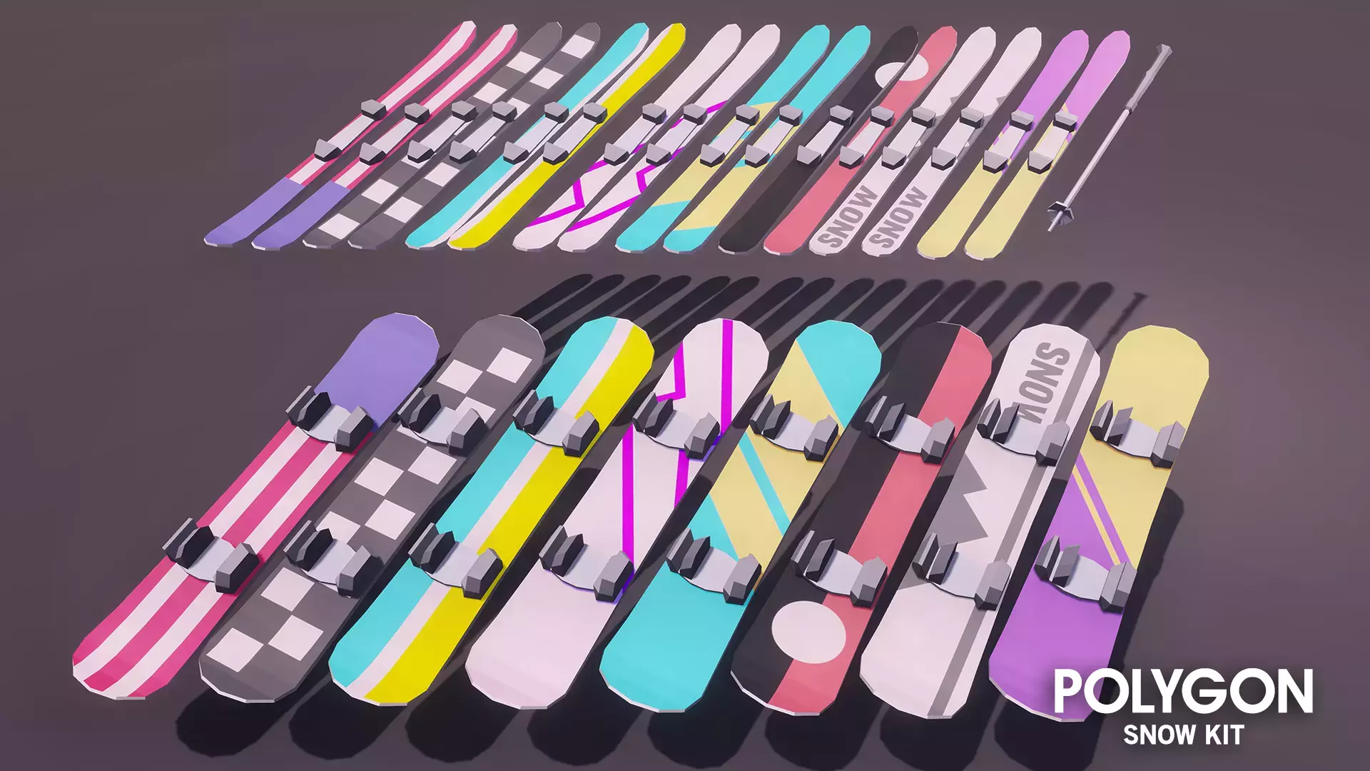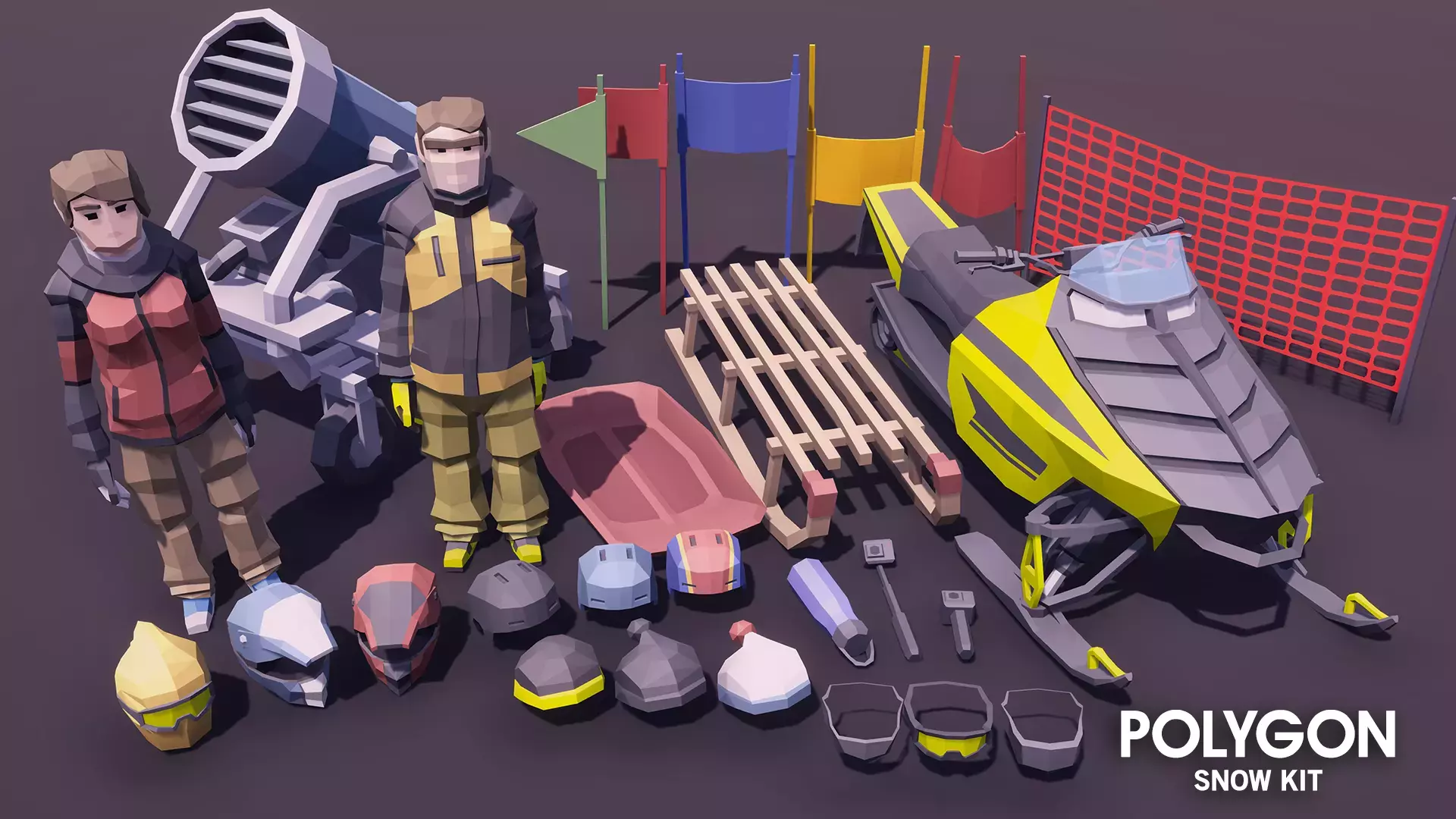 Набор низкополигональных персонажей, реквизита и транспортного средства для создания игры в полигональном стиле на снежную/ лыжную тематику.