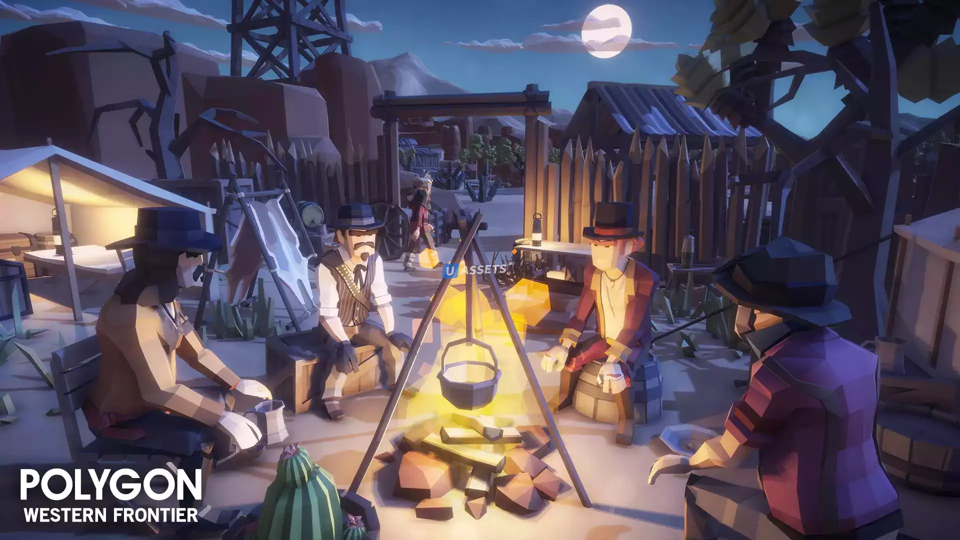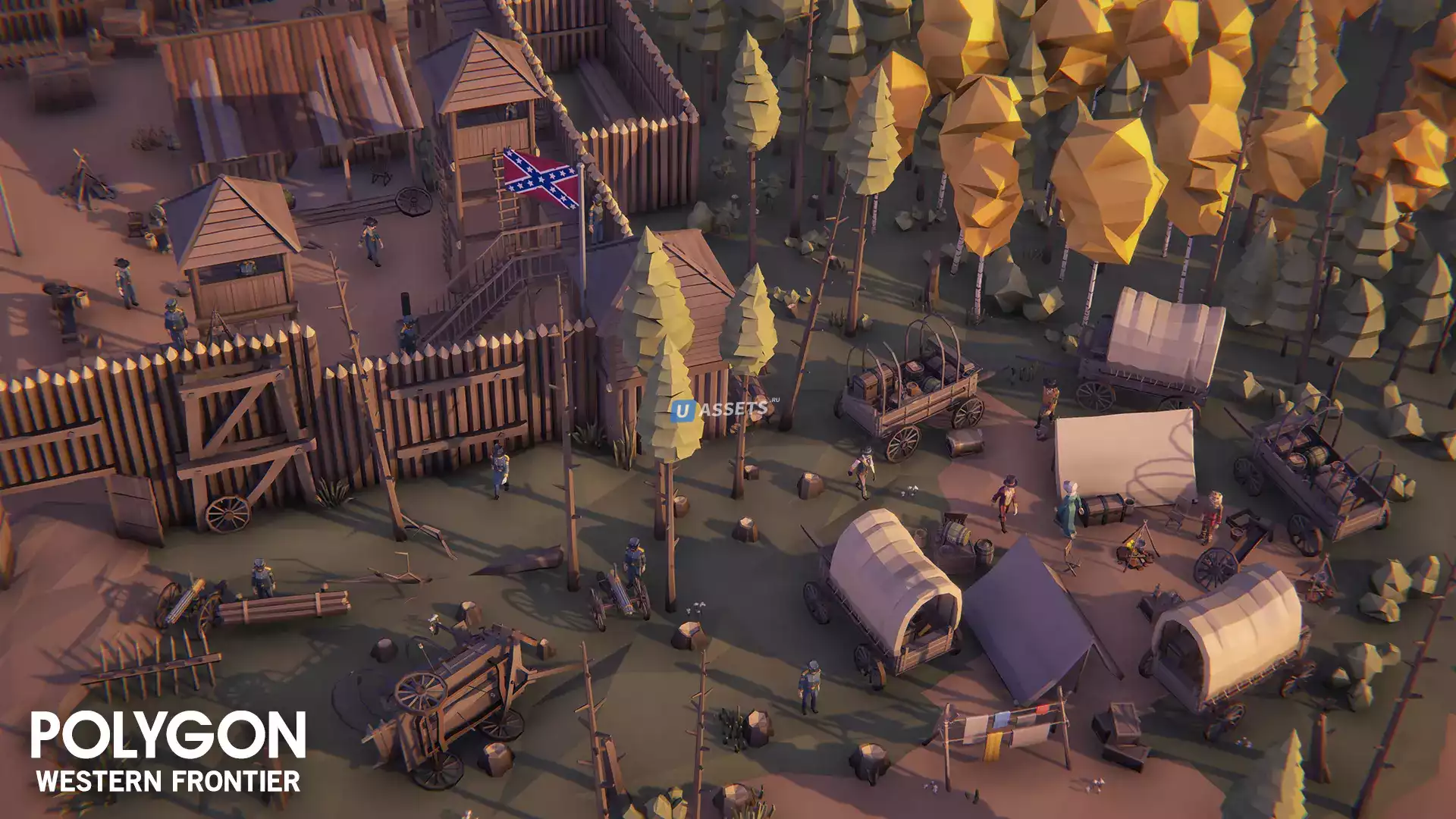 Эпический низкополигональный набор персонажей, реквизита, оружия, транспортных средств и ресурсов окружающей среды для создания полигональной игры в стиле вестерн.