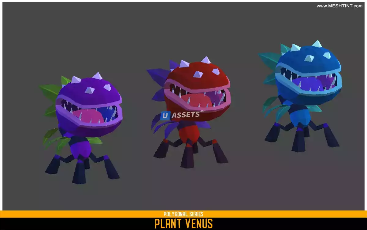 Этот набор содержит 1 существо: Растение Венера. Текстуры доступны в 3 цветах. Низкополигональная. Полисчет: 1286 треугольников. Риггинг и анимация. Стандартная установка mecanim настроена. Всего 17 анимаций.