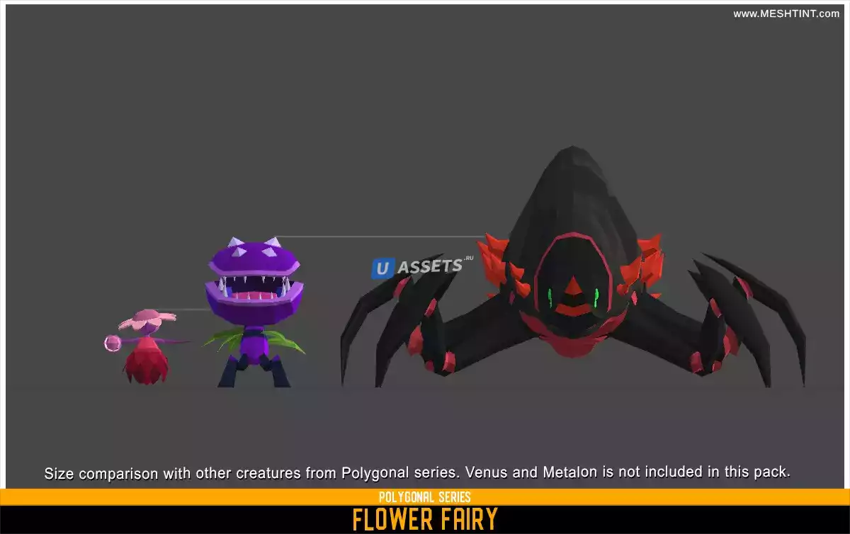 Этот пак содержит 7 существ из серии Polygonal. Цветочная фея, Страшилка, Металон, Гриб, Гороховый стрелок, Растение Дионея, Растение Венера. Они низкополигональные и просты в использовании. Если вам нравится этот пакет, обязательно ознакомьтесь с пакетом Polygonal Creatures Pack. Нажмите на ссылку выше, чтобы увидеть больше 3D-моделей серии Polygonal.