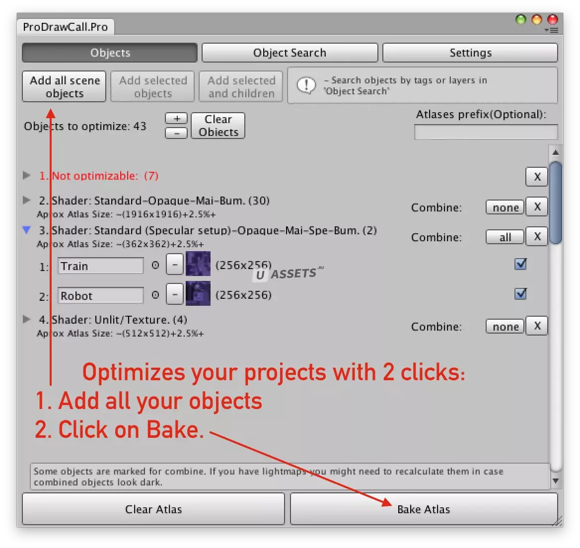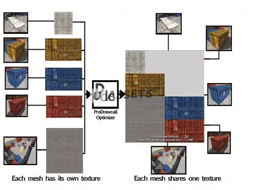 Pro draw call - это расширение редактора, которое легко сократит ваши вызовы рисования, создавая атласы для ваших моделей, чтобы они могли обмениваться материалами для статической / динамической пакетной обработки.