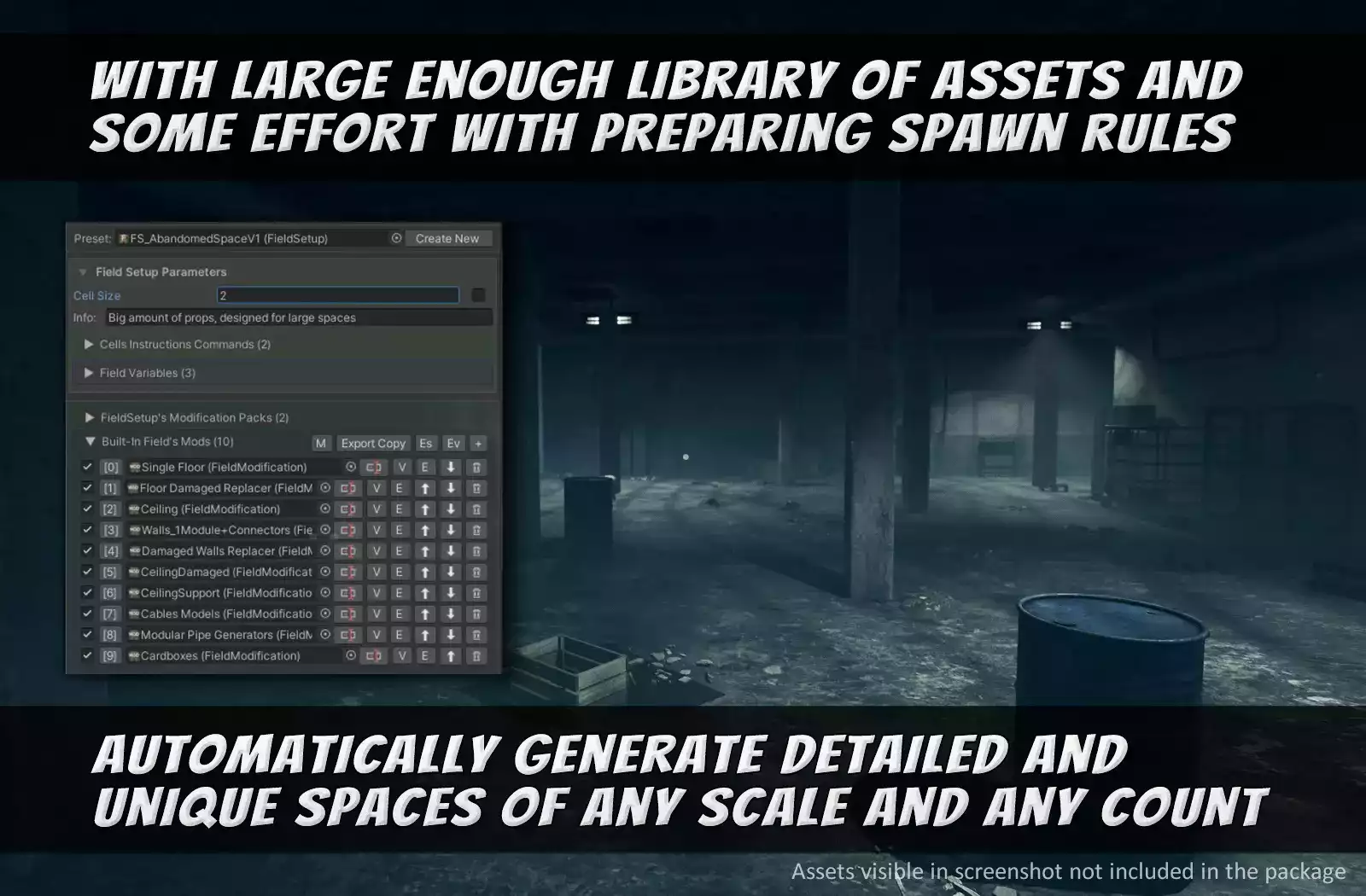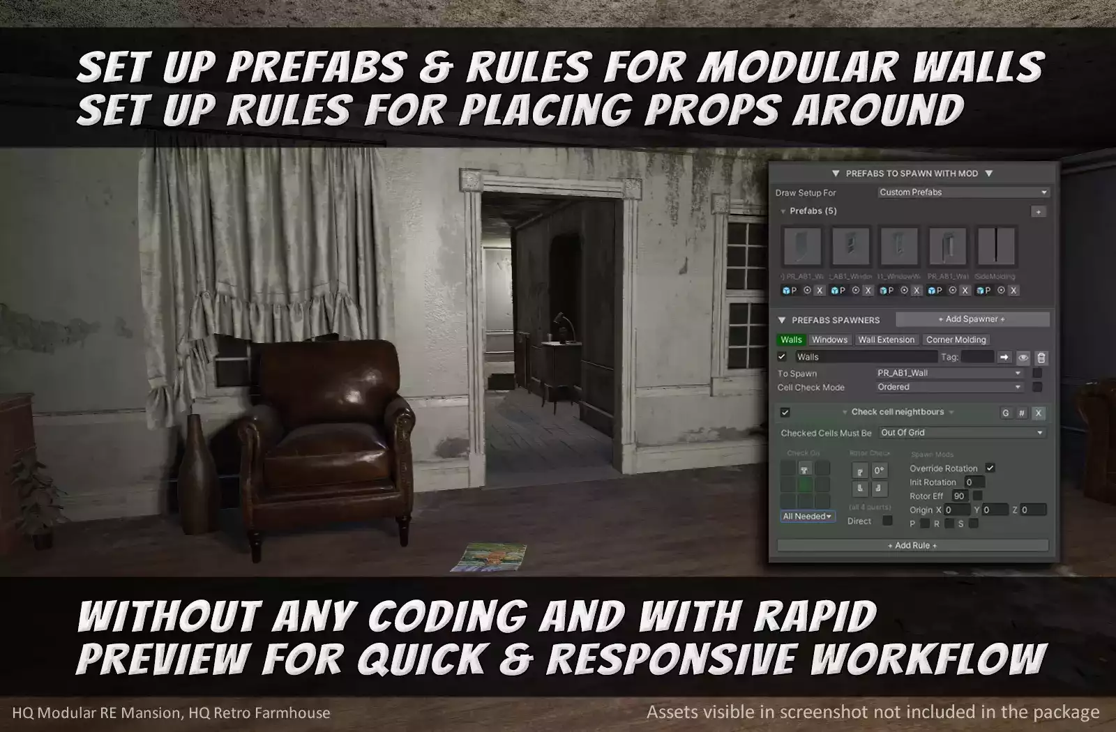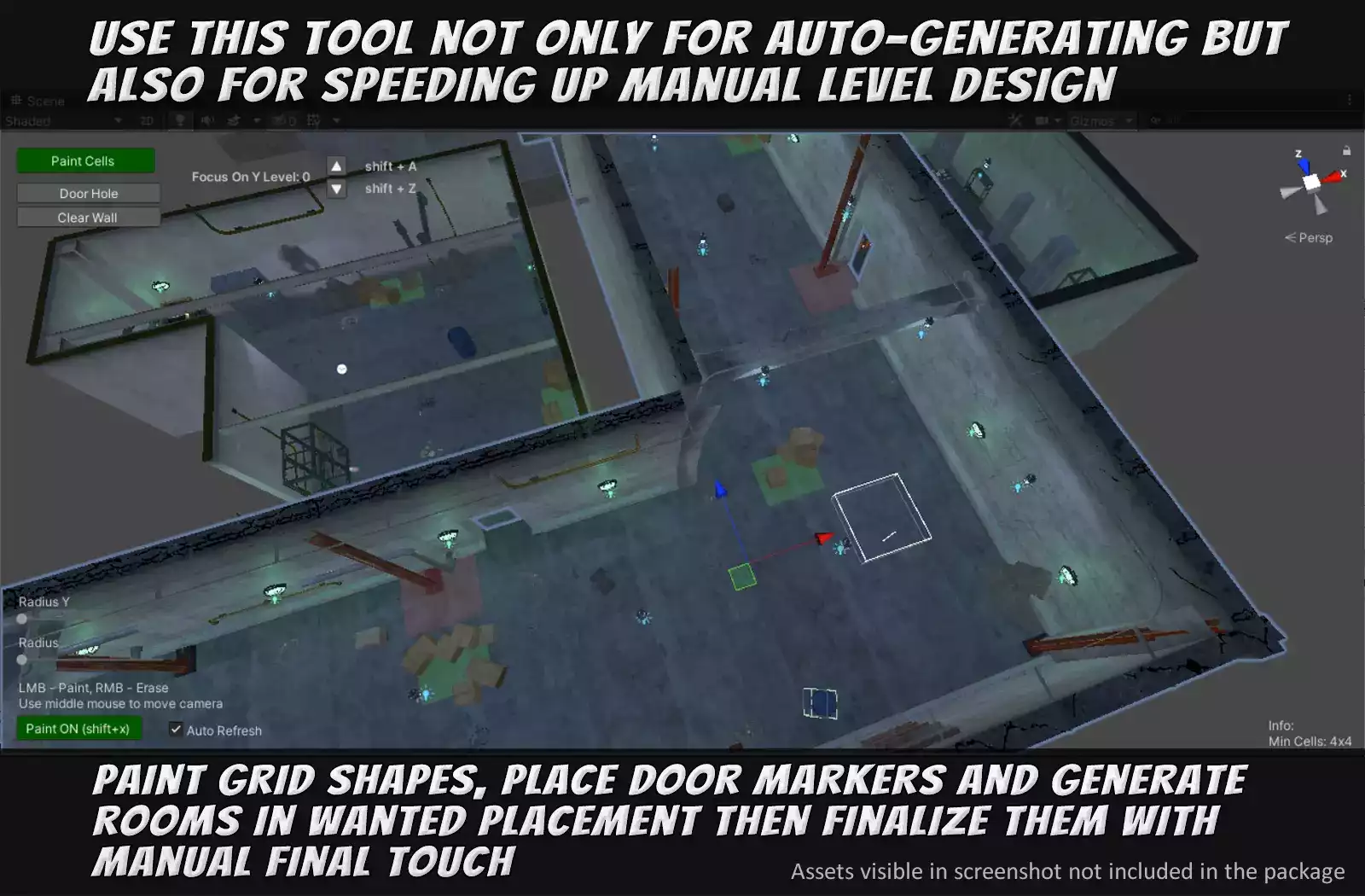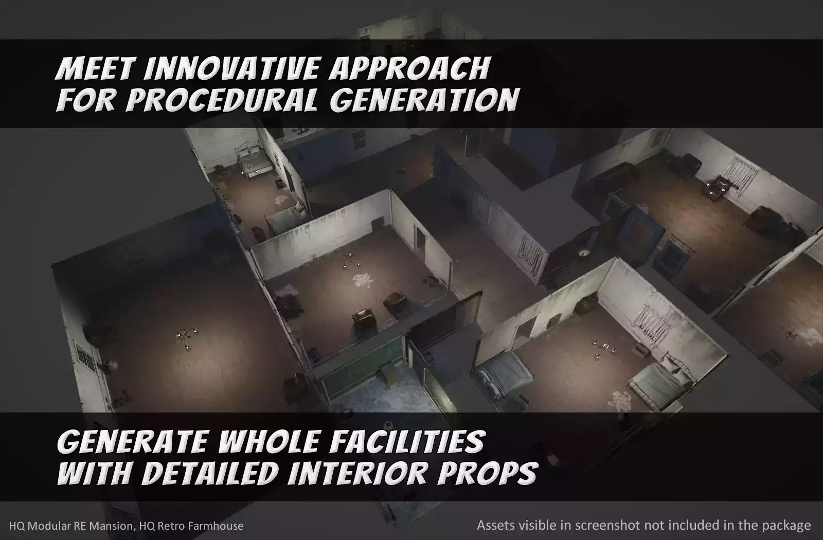 Ускорьте процесс проектирования уровней во много раз! Создавайте бесконечные индивидуальные уровни процедурно одним щелчком мыши! Никакого кодирования! Создавайте экстерьеры и интерьеры домов, реквизит, тротуары и многое другое!