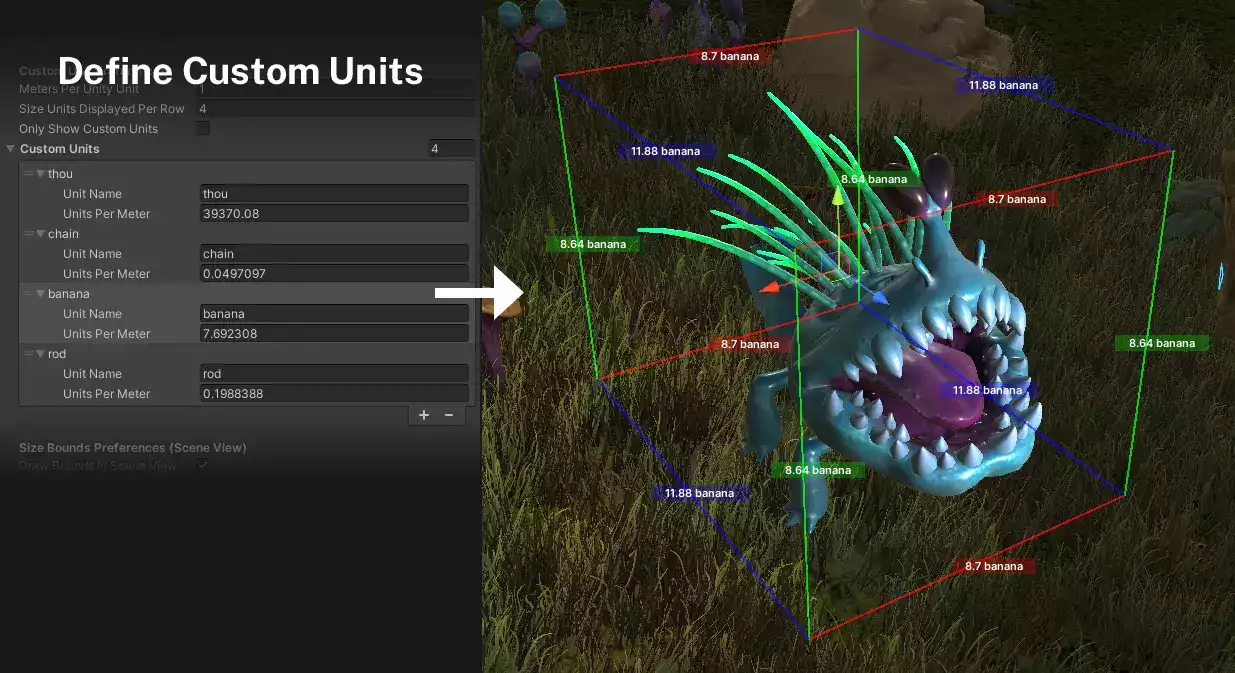 Реальный размер вычисляет границы выбранного объекта, включая или исключая его дочерние элементы. Границы имеют цветовую маркировку в соответствии с соответствующими цветами осей, а длины удобно обозначены в режиме просмотра сцены. Настройки цвета и видимости полностью настраиваемы.