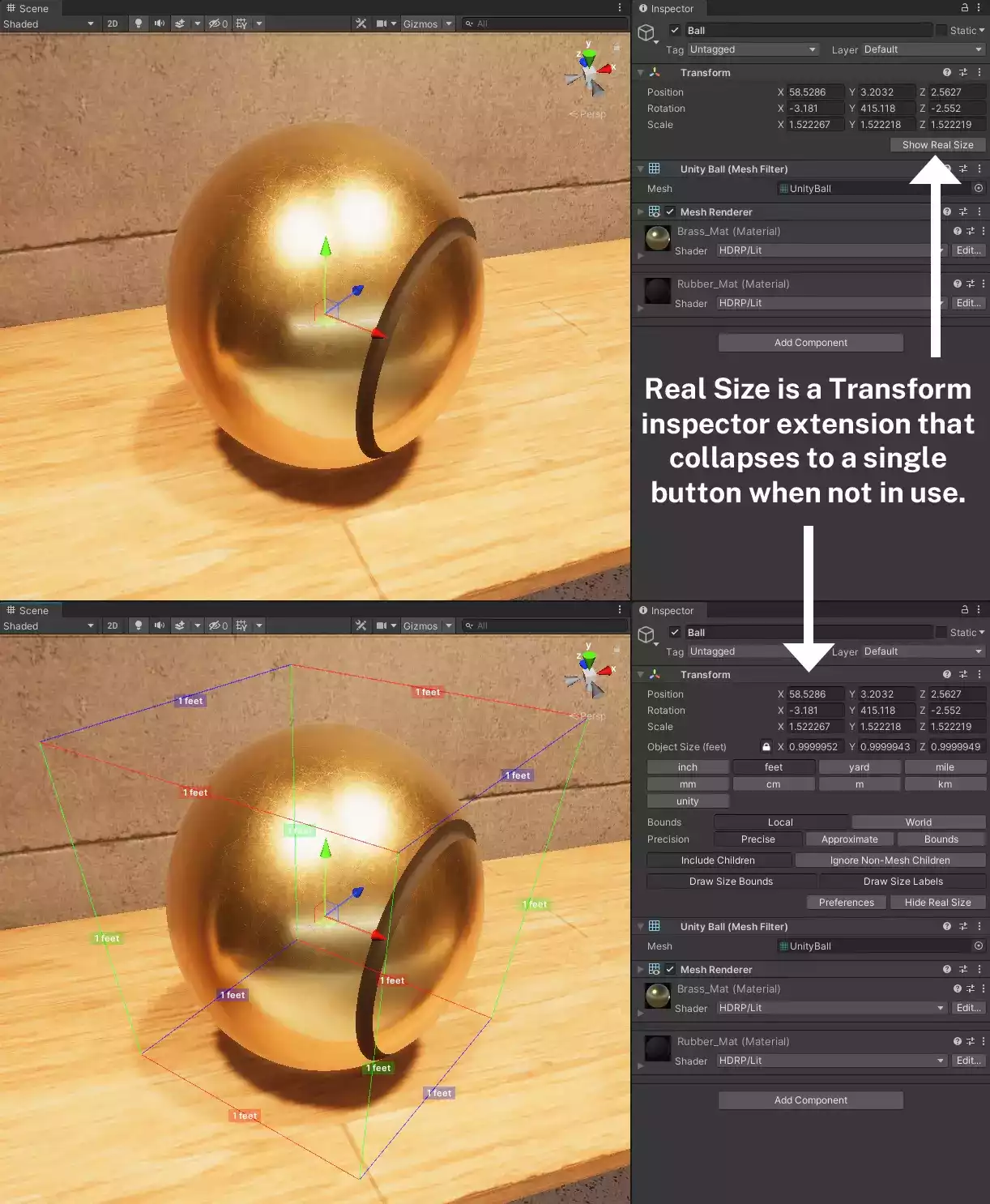 Real Size - это инструмент редактирования, который расширяет инспектор компонентов преобразования для всех игровых объектов. Нет необходимости добавлять дополнительные компоненты к вашим игровым объектам, это просто работает! Добавляйте реалистичные размеры к своим объектам и сохраняйте масштаб вашего мира неизменным!