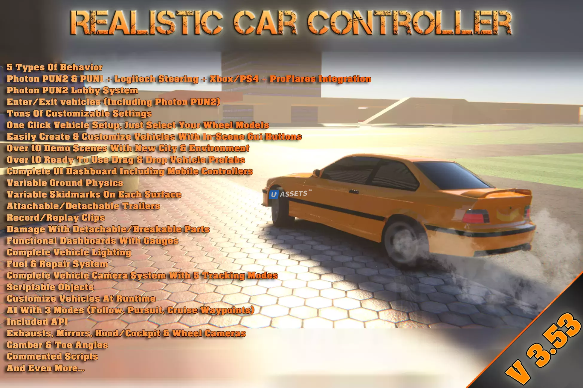 Создать свой собственный реалистичный автомобиль еще никогда не было так просто. Создание полностью функционального транспортного средства занимает всего около 5 минут! Один клик для настройки, переключения контроллеров, переключения поведения, настроек... Простой в использовании и очень настраиваемый. Поставляется с 9 предварительно настроенными моделями поведения автомобиля. Протестировано на платформах ПК, Mac, Android и iOS.