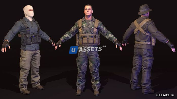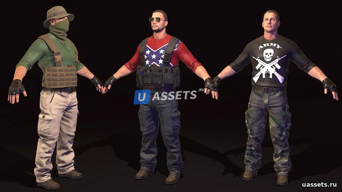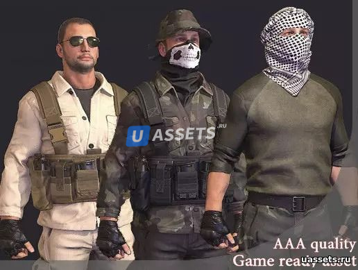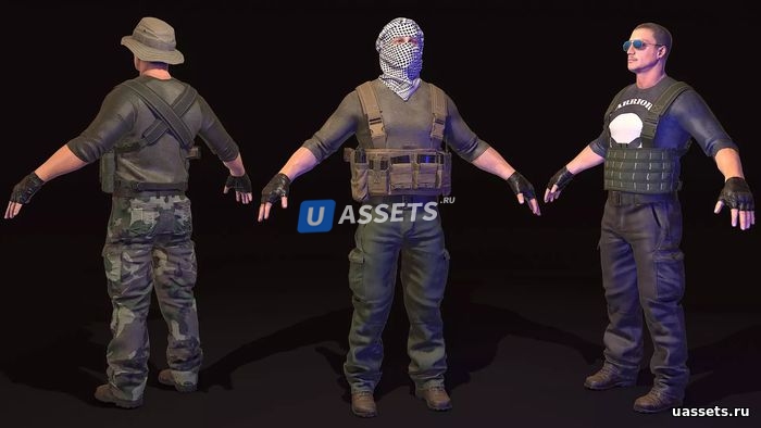 Набор включает в себя: 24 собранных персонажа, 50 материалов PBR для кастомизации, 9 частей тела и пистолет. Модель с оболочкой и скелет, совместимый с MotionBuilder/Unity Mecanim. У повстанцев есть кость для крепления оружия. Собранный персонаж содержит в среднем 12-14 тысяч полигонов.