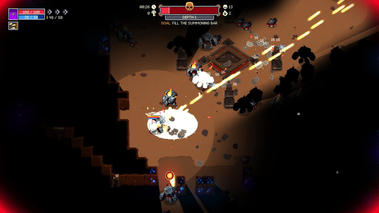 Все способности в игре являются активными. После применения они перезаряжаются от 30 до 60 секунд. Эти навыки позволяют, к примеру, устанавливать временные турели или кратковременно увеличивать скорость атаки. В вылазку можно взять только один такой стартовый скилл. Для способностей также предусмотрены модификации, дающие как положительные, так и отрицательные эффекты. Разработчики вдохновлялись культовой инди-игрой Vampire Survivors. Бои разворачиваются в пещерах, где можно разрушать стены кувалдой, чтобы добывать руду. За руду, как и за победы над врагами, начисляется опыт. При накоплении достаточного количества опыта уровень персонажа повышается, и игрок выбирает один из трёх случайных перков, которые при желании можно перебрать.В инди-игре Repetendium представлены три уникальных персонажа: