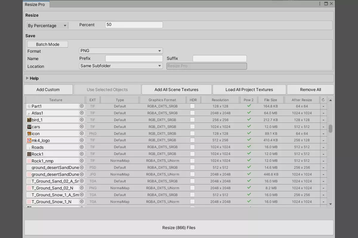 Размер текстур в редакторе можно изменять непосредственно из окна проекта или с помощью пакетного конвертера со встроенным инструментом преобразования текстур.