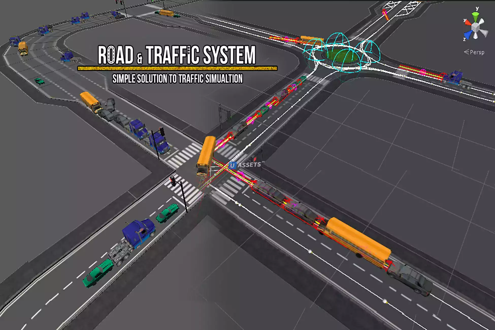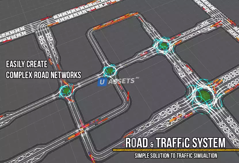Road & Traffic System - это плагин, разработанный для Unity, позволяющий пользователям быстро создавать и моделировать небольшие или большие динамические транспортные сети для любого вида транспортных средств с помощью размещения различных участков дороги и светофоров.