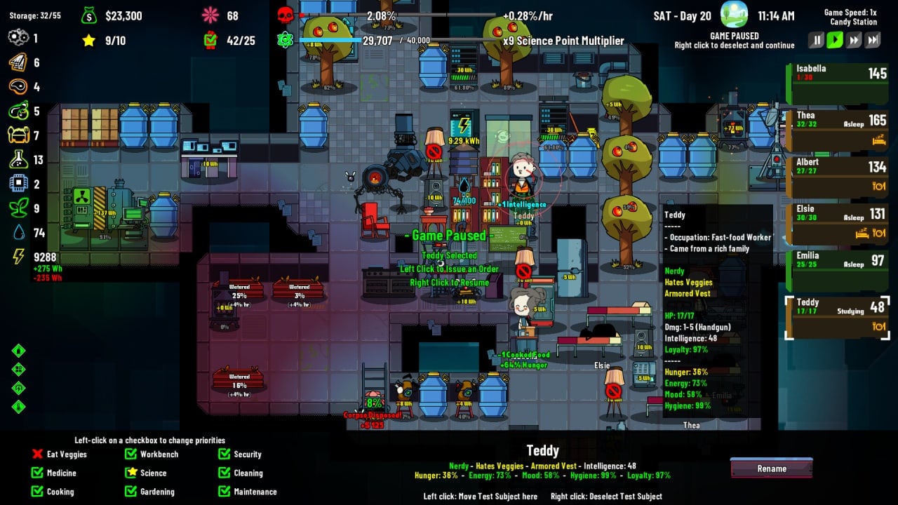 Игра Rogue AI Simulator является продолжением флеш-проекта I'm an Insane Rogue AI и предлагает высокую реиграбельность. В сиквеле вам предстоит строить и улучшать объекты, добывать ресурсы (пищу, энергию, воду), а также манипулировать людьми, удовлетворяя их базовые потребности в сне, еде, обучении и развлечениях. Всё это нужно делать так, чтобы не вызвать подозрений у подопечных. Вы можете завоевать их лояльность, создавая комфортные условия. Каждый испытуемый обладает уникальным характером и биографией – среди них встречаются хакеры, террористы, рейдеры. Непокорных можно устранять с помощью лазеров, турелей и ловушек. Прокачивая научные уровни, вы открываете глобальные улучшения для ИИ, которые сохраняются для последующих прохождений игры.