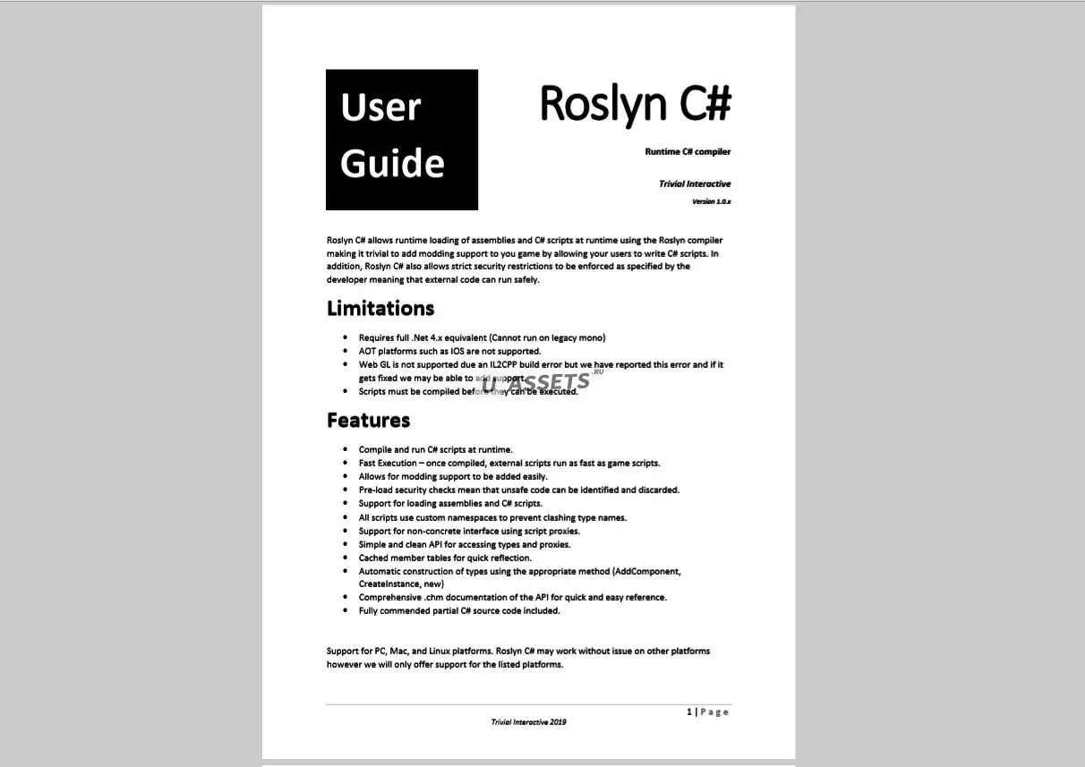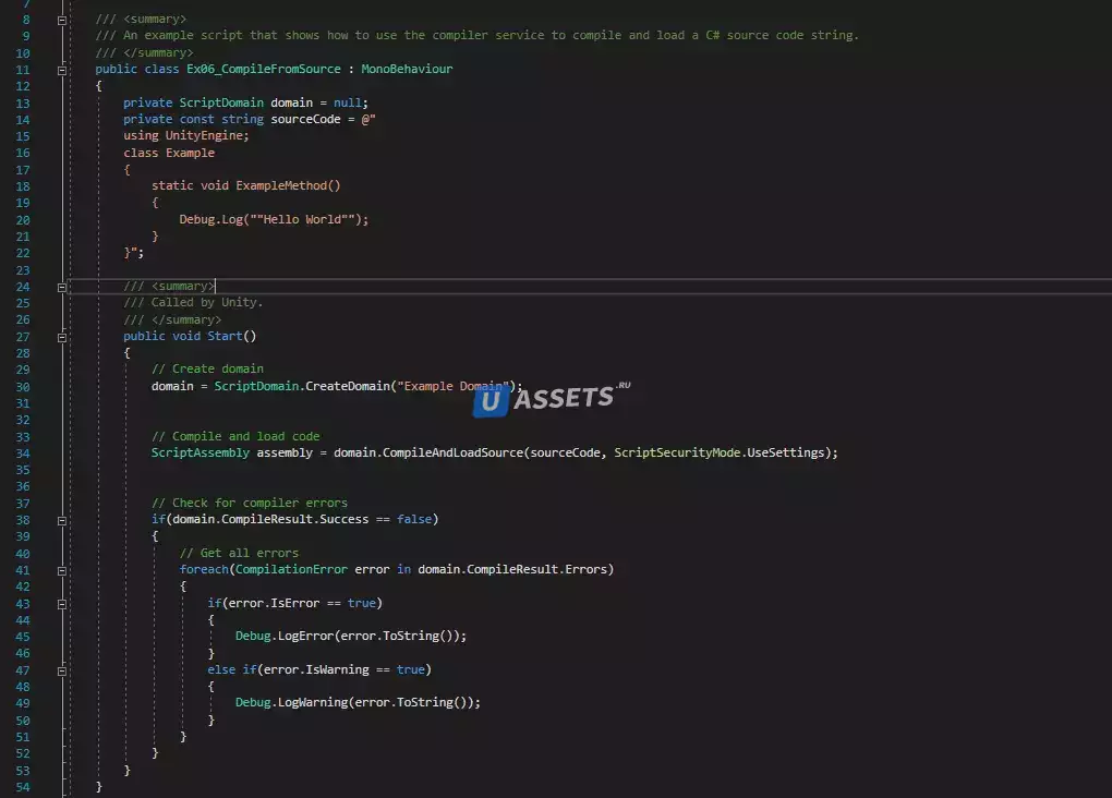 Roslyn C# позволяет загружать сборки и скрипты C# во время выполнения с помощью компилятора Roslyn, что упрощает добавление поддержки моддинга или внутриигрового программирования в ваш проект. Кроме того, Roslyn C# также включает проверку безопасности кода, которая позволяет указать ряд ограничений безопасности, которым должен соответствовать загруженный код, включая недопустимые пространства имен и типы. Это значительно повышает безопасность загрузки стороннего кода из неизвестных источников.