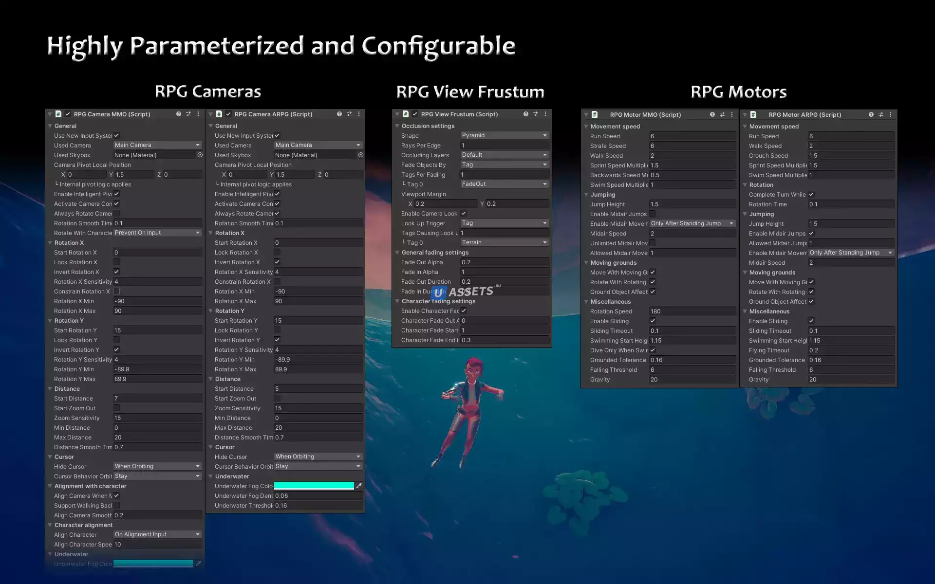 2 RPG-камеры и контроллеры персонажей в одном пакете: MMO и Action RPG. Многофункциональный и простой в настройке. Качественный, полностью прокомментированный код. Мои обзоры активов говорят сами за себя.