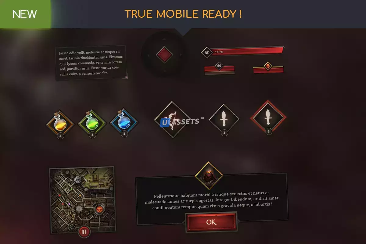 Лучший интерфейс - это гибкий интерфейс. Эта коллекция представляет собой общую коллекцию ресурсов, предназначенных как для MMORPG, так и для традиционных интерфейсов RPG. Темный и грубый дизайн с уникальной расцветкой делает это идеальное интерфейсное решение, выделяющее ваш проект на фоне остальных.