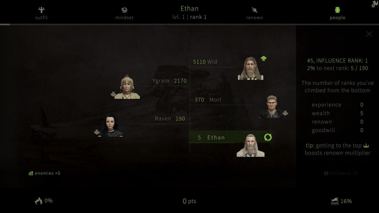 Дипломатия играет важную роль в отношениях и в борьбе за лидерство. Развитие этих навыков поможет находить союзников и разрешать конфликты мирным путём. Протагонист будет соперничать за славу, уважение, последователей и богатство. Расширяя границы сознания, герой сумеет преодолеть внутренние ограничения, сковывающие его возможности. Многие конкуренты имеют тайны и уязвимости, раскрыв которые, можно получить серьёзное преимущество в этой игре.