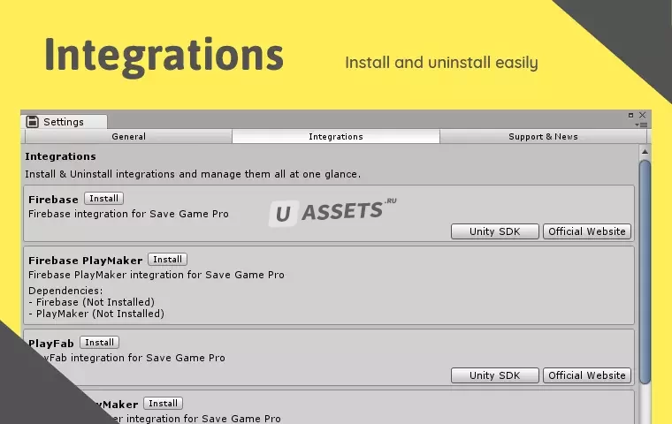☀Интеграция PlayMaker: Save Game Pro полностью интегрируется с PlayMaker, добавляя методы API Save Game Pro в качестве действий в PlayMaker. Кроме того, каждая интеграция также включает в себя действия плеймейкера.