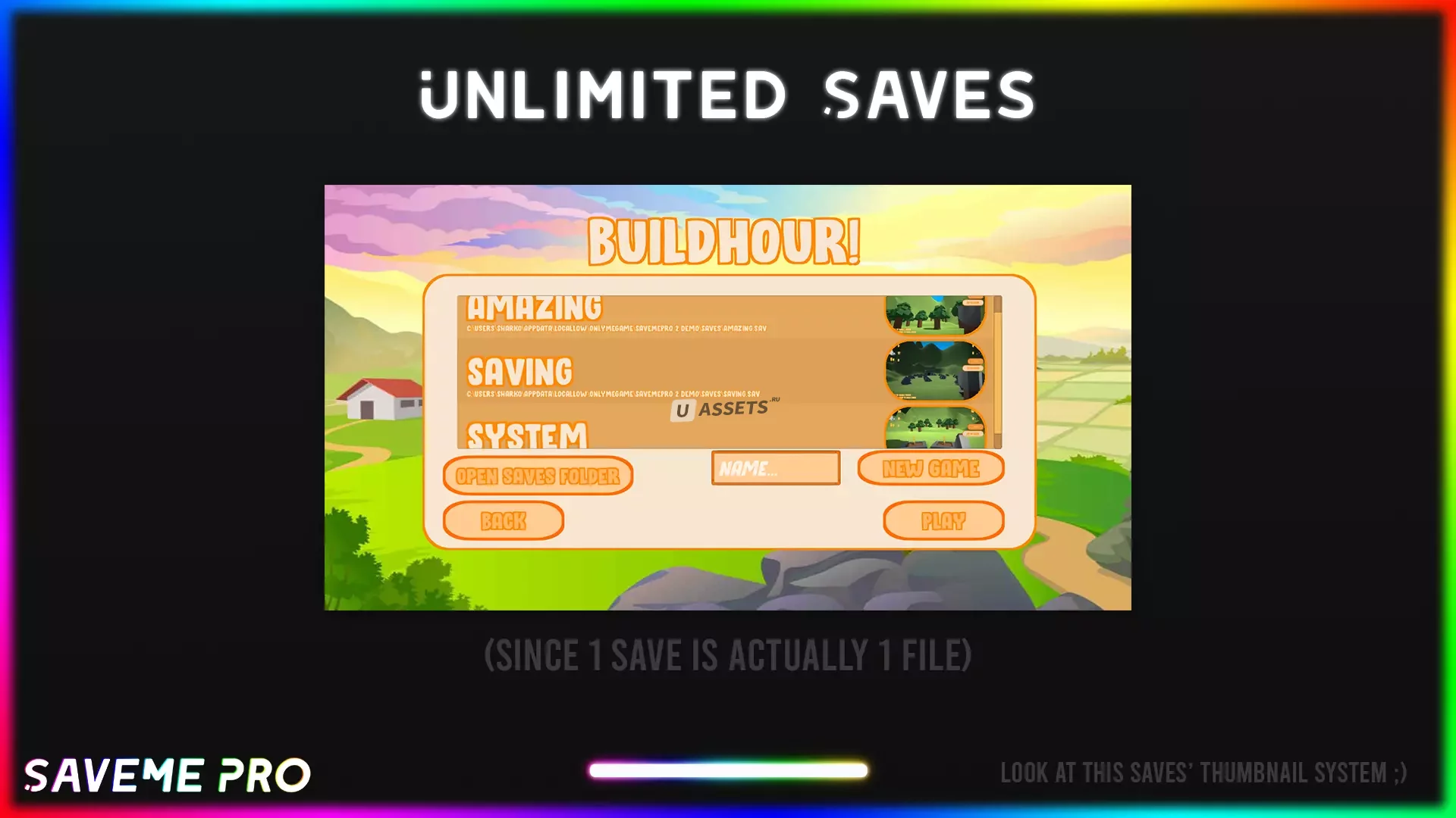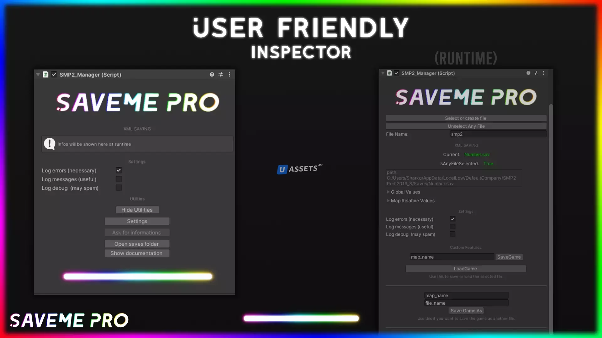 SaveMePro 2 - это интеллектуальное мощное средство сохранения, которое позволяет сохранять несколько сцен в одном файле или в облаке! Вы можете сохранять объекты, созданные во время выполнения, пользовательские значения (например, строку, int, bool, цвет, вектор и т. Д.), Даже объекты, которые уже находятся в сцене, но вы переместили их во время выполнения. Вы можете легко достичь всего этого с помощью полностью настроенного редактора и класса.