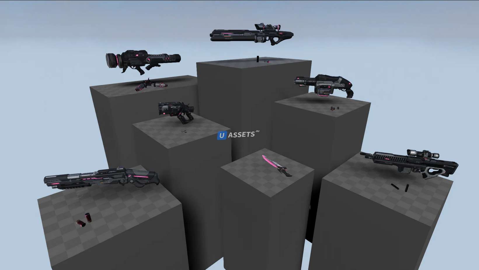 7 видов оружия в стиле научной фантастики. Готов к использованию в вашем следующем проекте. Включает в себя анимацию, звук и FX.
