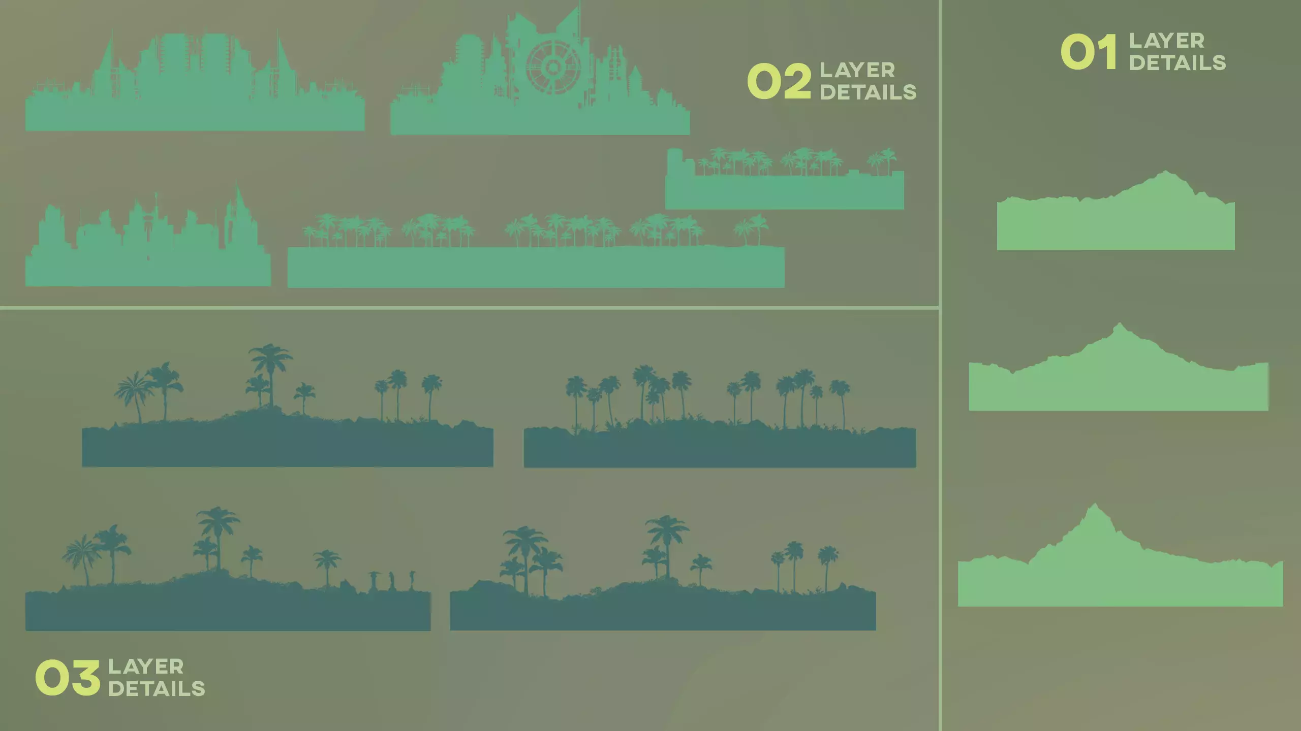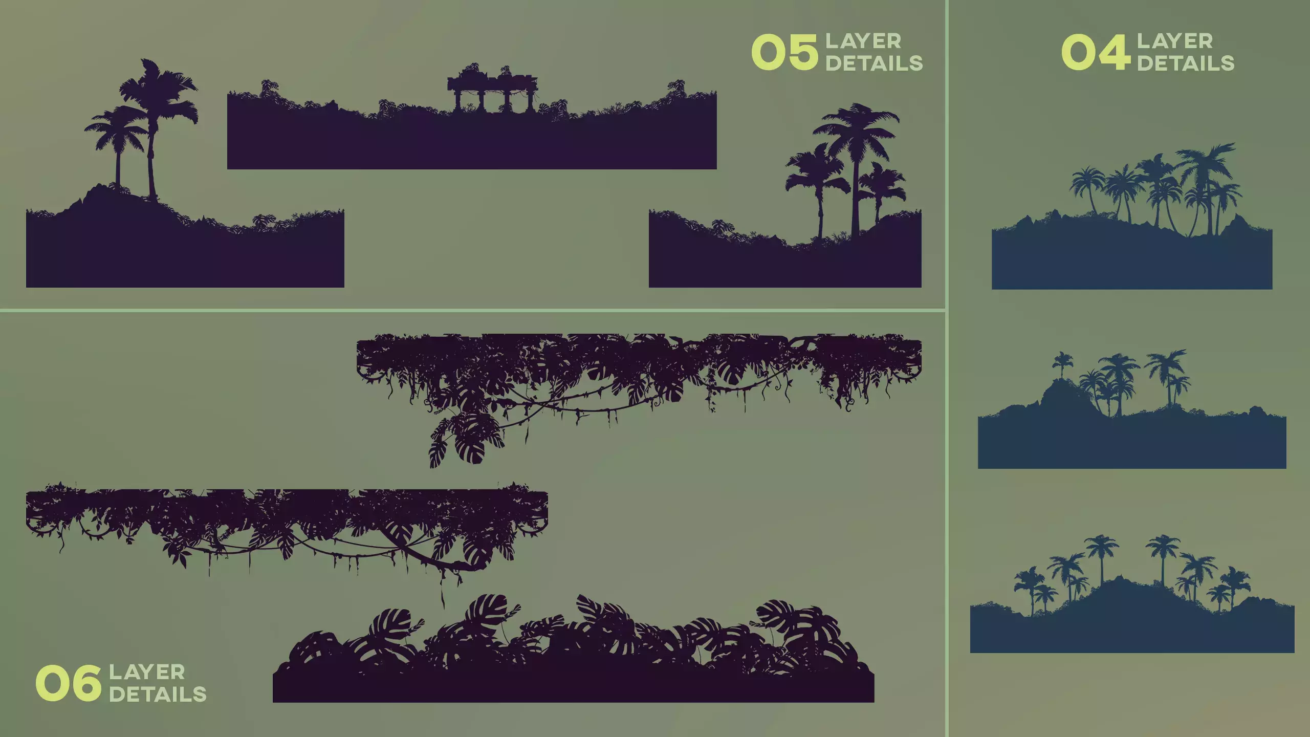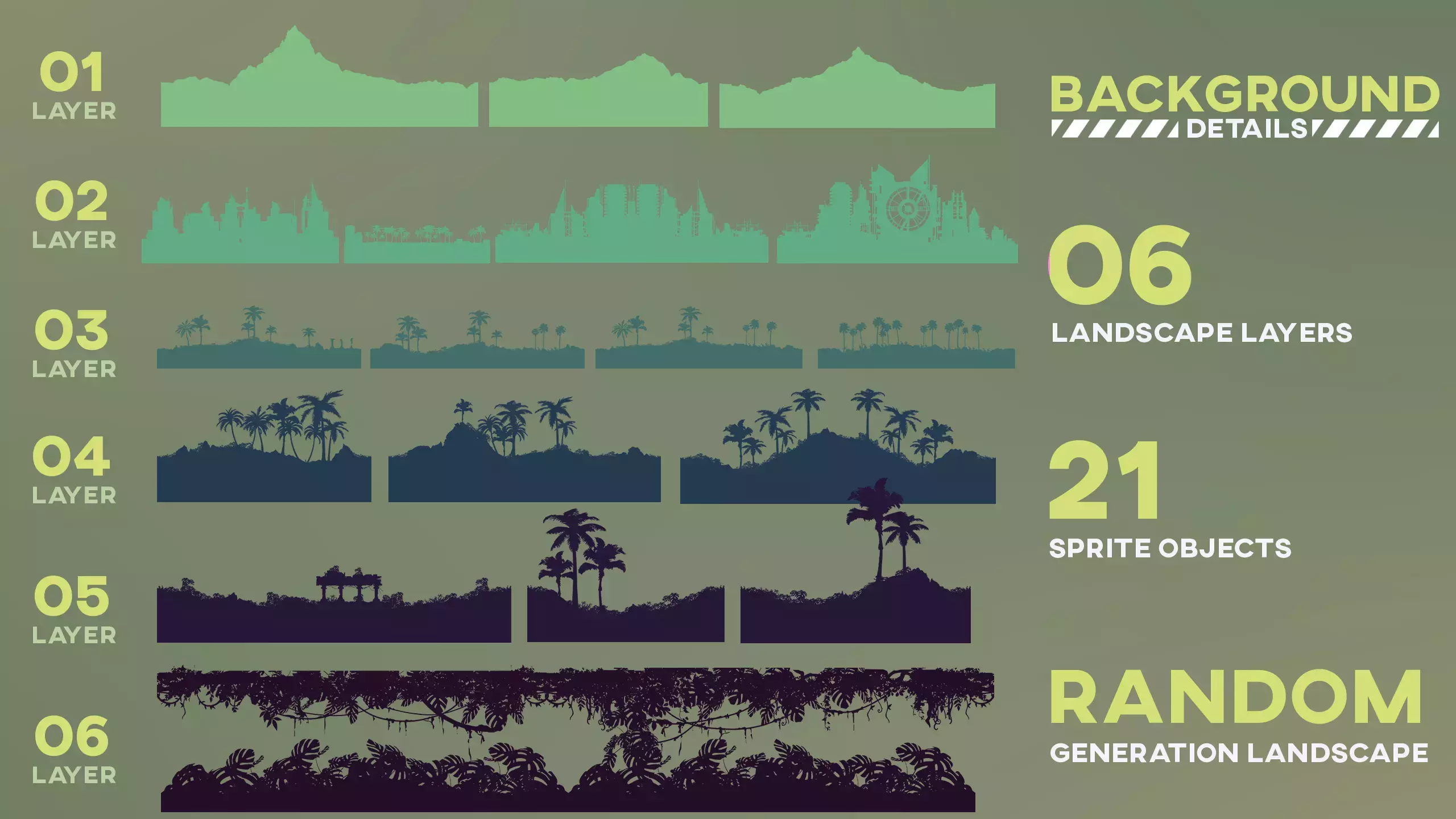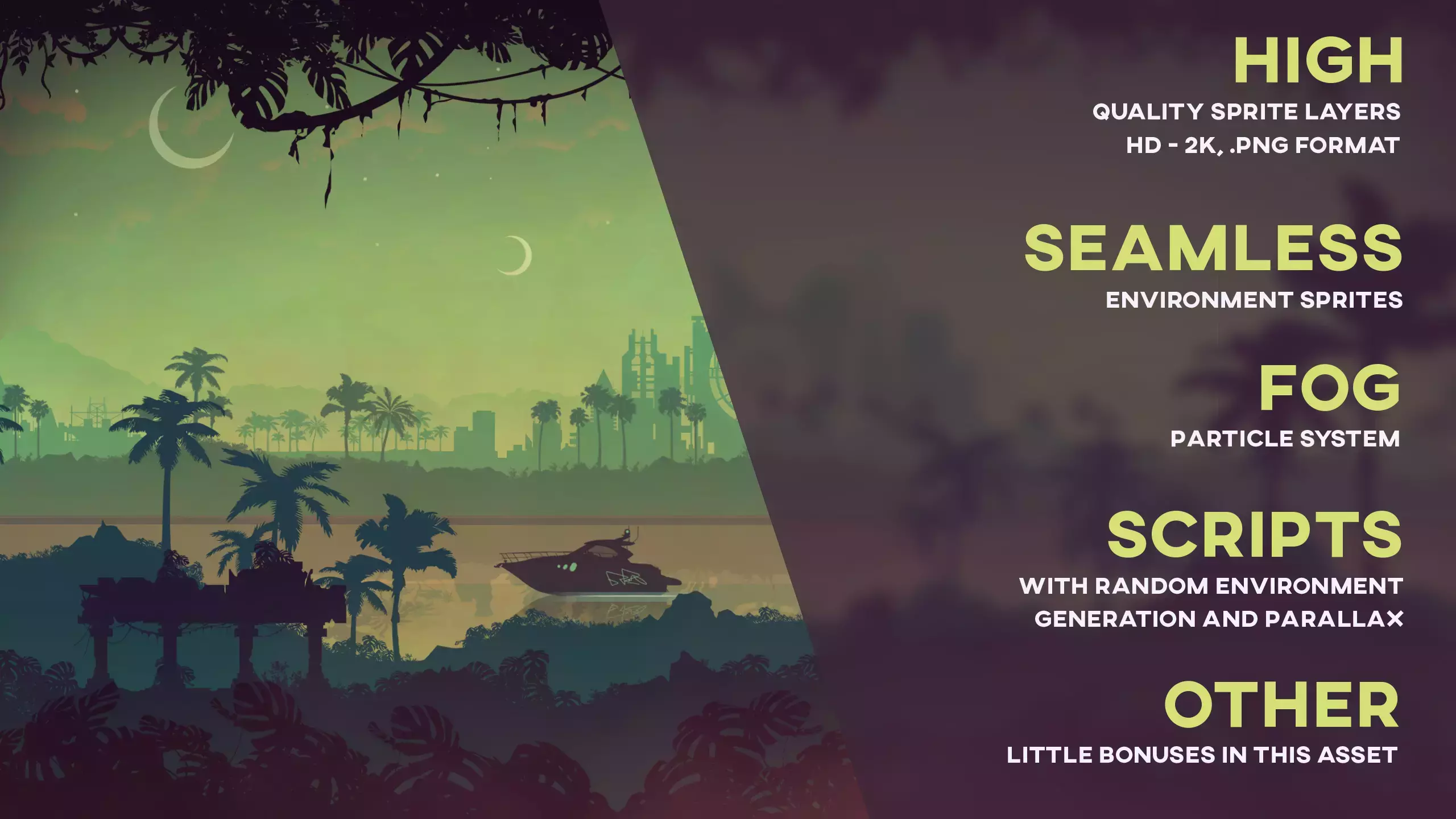 Набор спрайтов с пейзажами джунглей с эффектом параллакса! Сцена легко настраивается и изменяется. Идеально подходит для аркадных/гоночных игр, титров, открытий и других проектов!