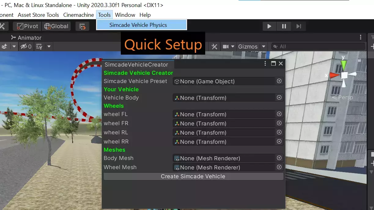 Sim-cade Vehicle Physics - это дружественный к мобильным устройствам и очень простой в использовании инструмент. В нем есть инструмент быстрой настройки, в котором вы просто даете ссылки на кузов и колеса автомобиля, нажимаете кнопку и ваш автомобиль готов.