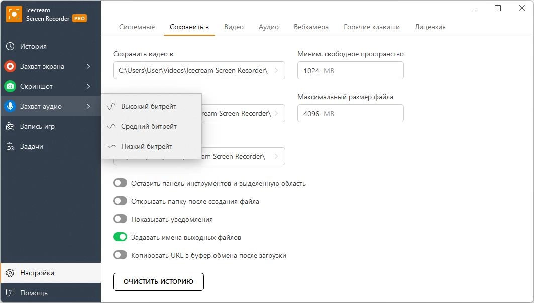- Расширенные настройки аудио: гибкая регулировка громкости записи с микрофона и системных звуков.
