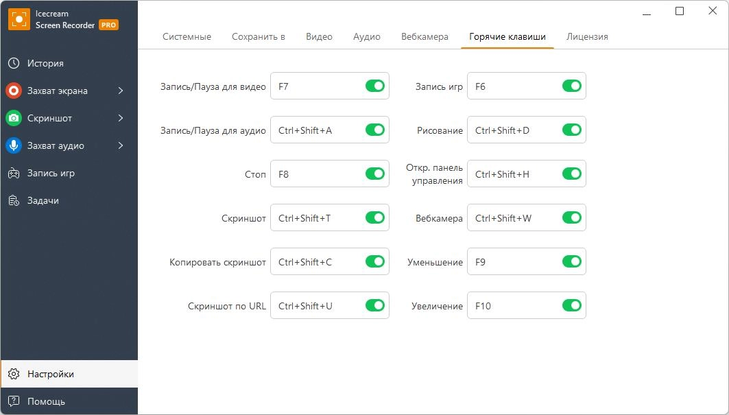 - Удобство работы: история всех записей, сохранение скриншотов в буфер обмена, настройки отображения курсора мыши и многое другое.