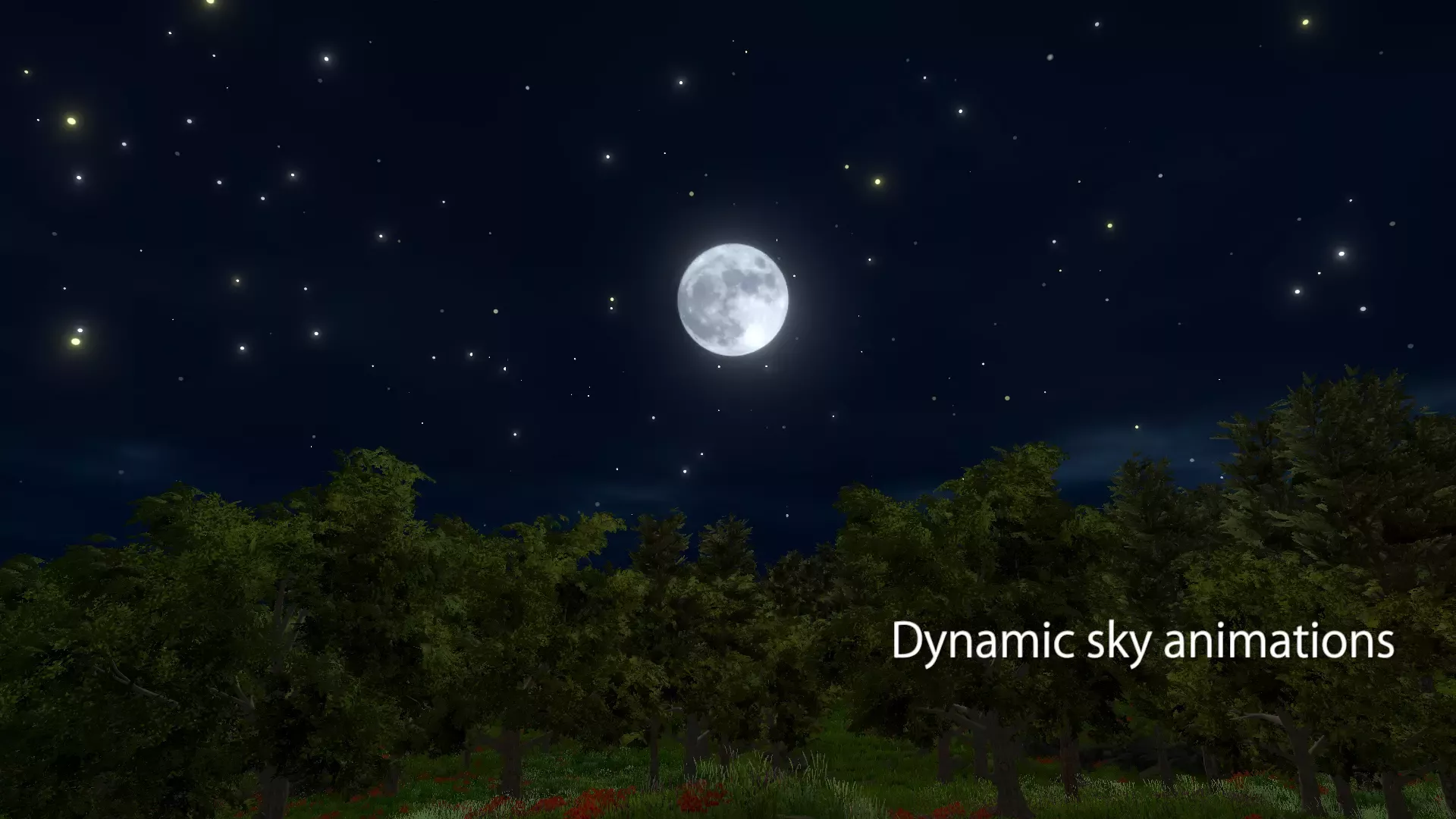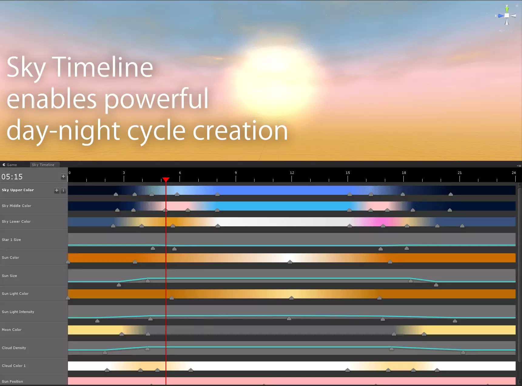 Временная шкала неба, уникальная для Sky Studio, позволяет создавать детализированные переходы анимации неба и управлять более чем 90 анимируемыми свойствами неба и погоды. Легко создавайте пользовательские циклы смены дня и ночи, которые анимируют звезды, дождь, молнию, облака и траектории движения солнца / луны по орбите. Независимо от того, создаете ли вы небольшой проект или сложную игру, Sky Studio поможет вам создать пользовательское небо, которое вы себе представляете!