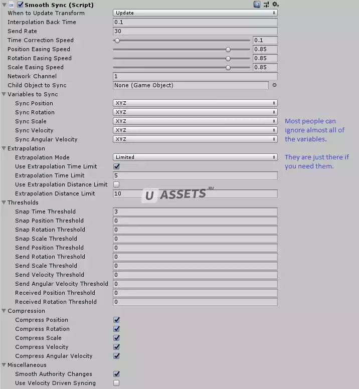С легкостью сглаживает Rigidbody и преобразовывает по сети. Просто добавьте скрипт SmoothSync к любому игровому объекту и смотрите, как он будет плавным.