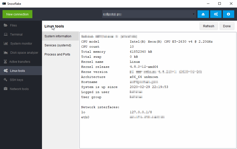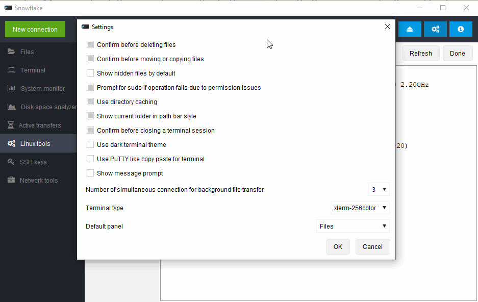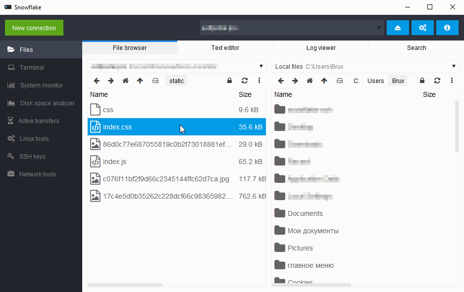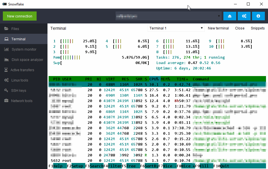 Кроме этого клиент имеет ряд на мой взгляд важных инструментов, встроенных по умолчанию, такие как файловый браузер, эмулятор терминала, менеджер ресурсов / процессов, анализатор дискового пространства, текстовый редактор, просмотрщик журналов и множество других полезных инструментов, которые облегчают работу с удаленными серверами. Snowflake протестирован в работе с рядом операционных систем, Ubuntu, CentOS, RHEL, OpenSUSE, FreeBSD, OpenBSD, NetBSD, Windows и HP-UX. Более подробную информацию можно найти на GitHub https://github.com/subhra74/snowflake/.