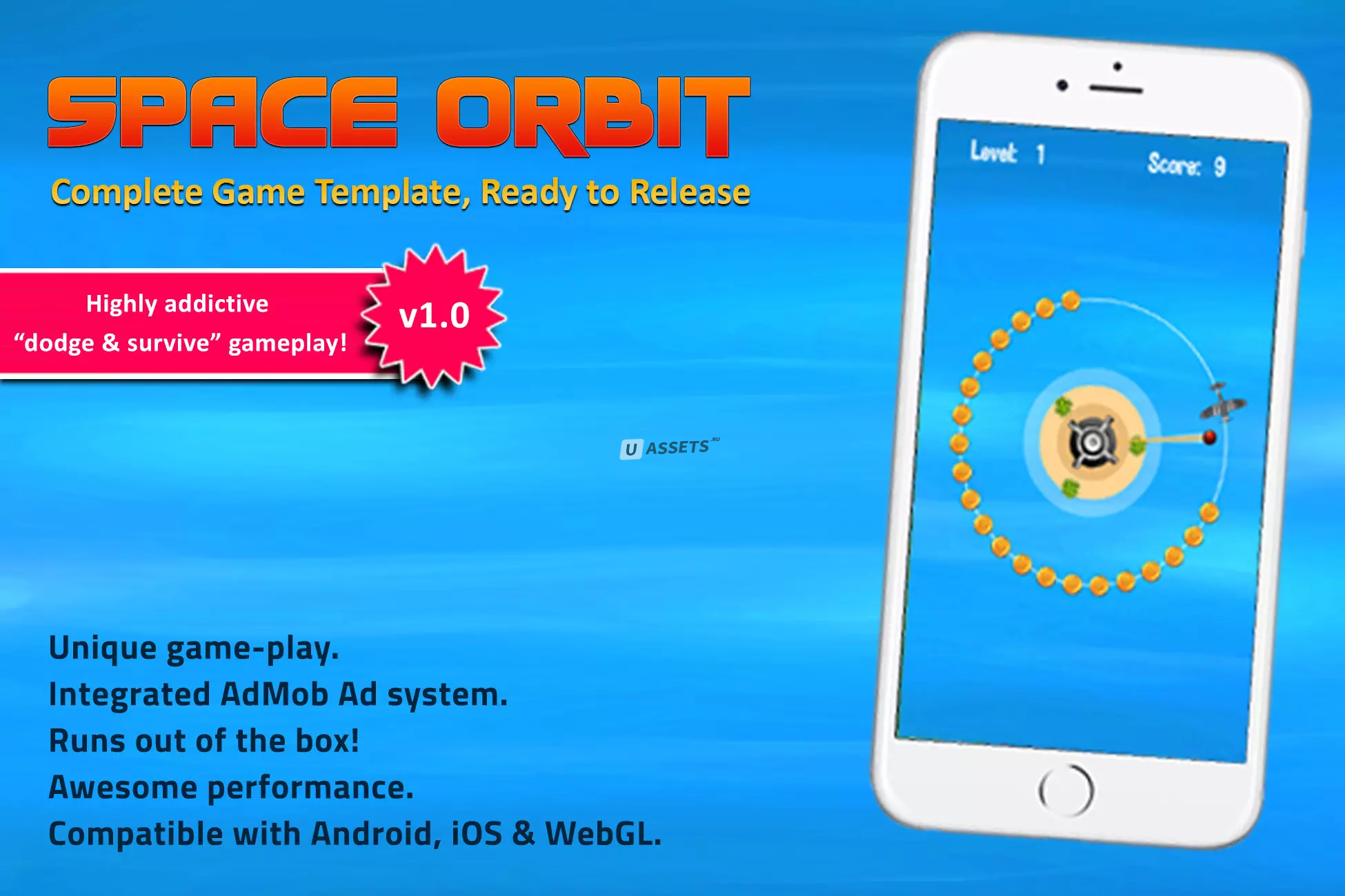 Space Orbit — это веселый и очень захватывающий шаблон казуальной игры для Unity3D. Это игра, которая понравится всем членам семьи! и вы можете играть практически где угодно в свободное время. Вам просто нужно увернуться от ракет и собрать все монеты, чтобы перейти на следующий уровень. Все, что вам нужно сделать, это нажать на экран в нужное время, так как игрок будет менять направление своего движения, когда вы нажимаете.