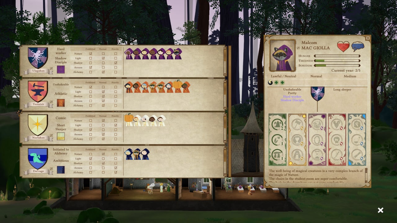 Игроку предстоит заниматься тонким управлением школой, контролируя её бюджет и своевременно ремонтируя оборудование для бесперебойной работы. Высокий уровень обучения достигается благодаря найму опытных преподавателей, чьи глубокие знания помогут студентам в полной мере освоить волшебное искусство.